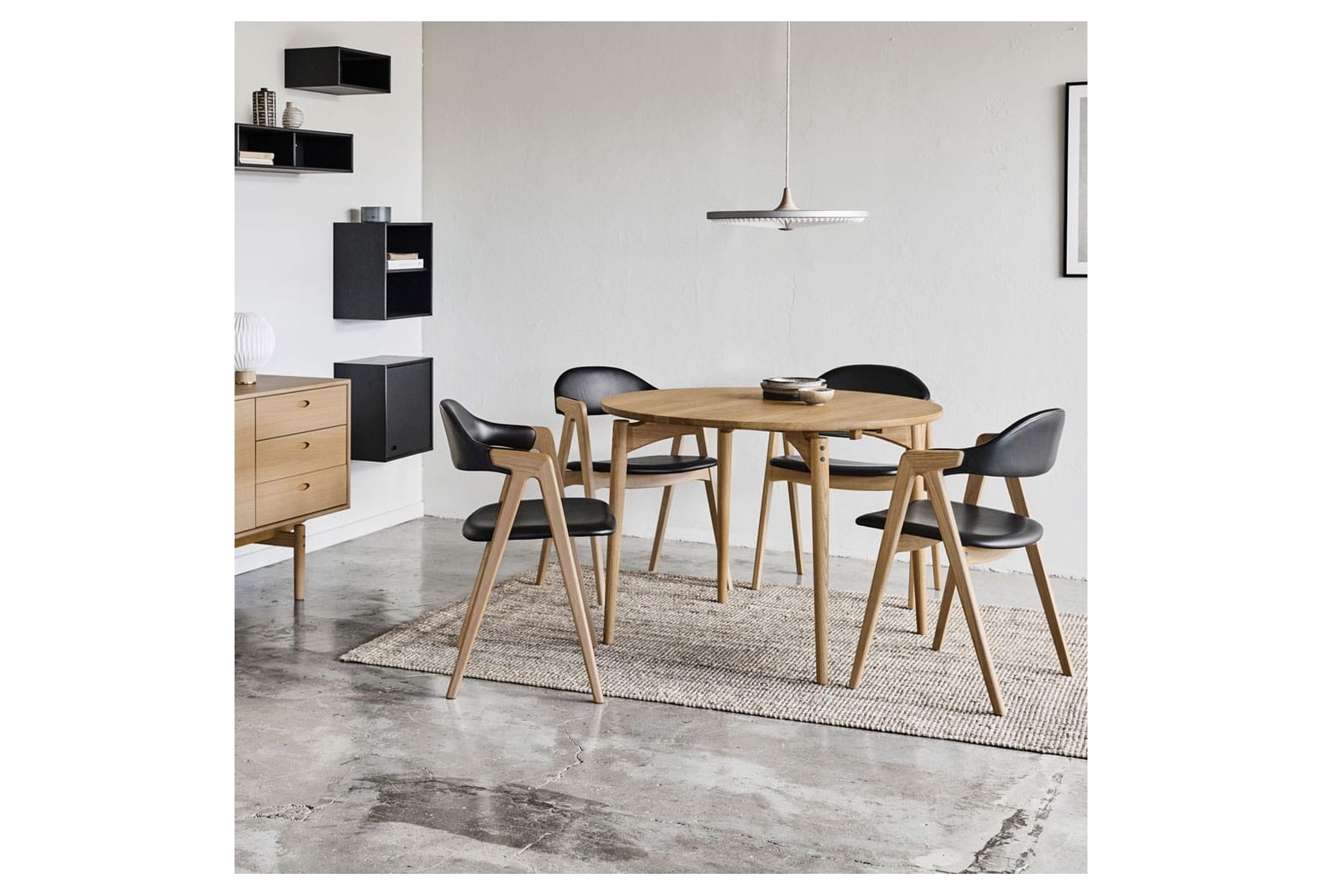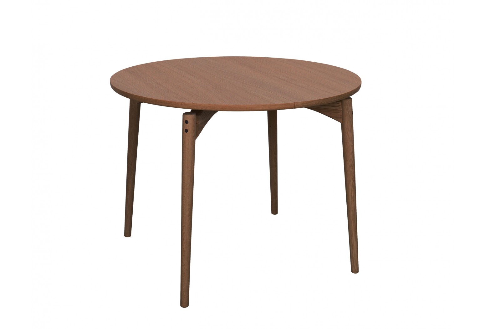 Kulatý jídelní stůl Aeris. Stoly Aeris mají elegantní a klasický vzhled s moderním nádechem dánské jednoduchosti. Rozšiřující desky nejsou součástí stolu a objednávají se zvlášť. Vhodný pro 4 osoby, po rozšíření pro 8 osob.