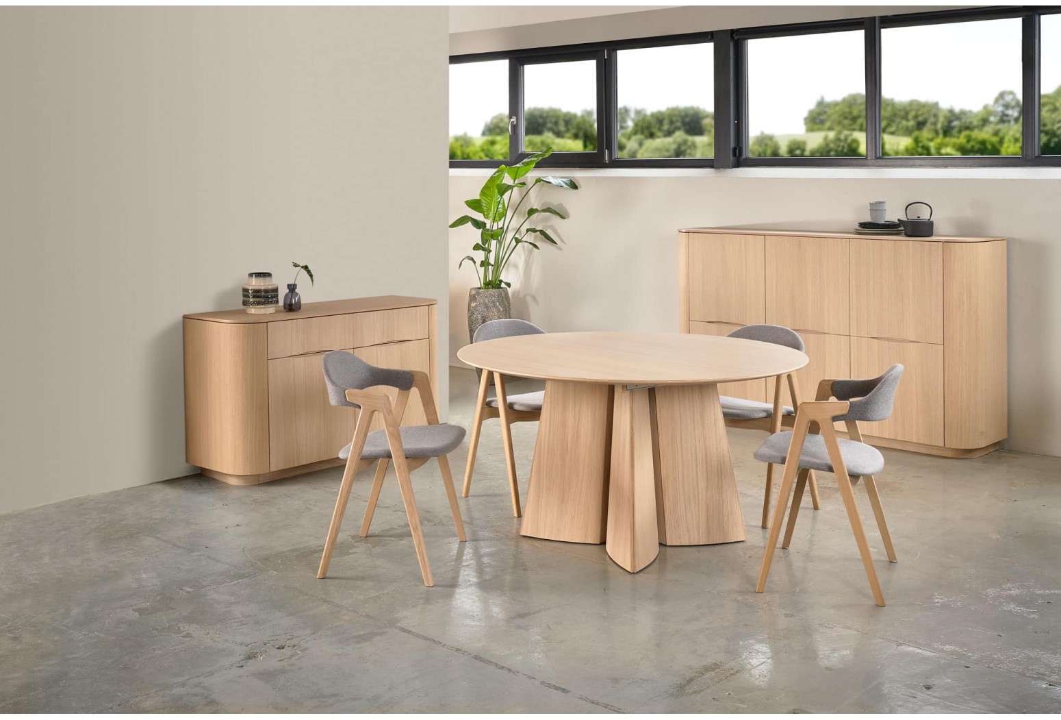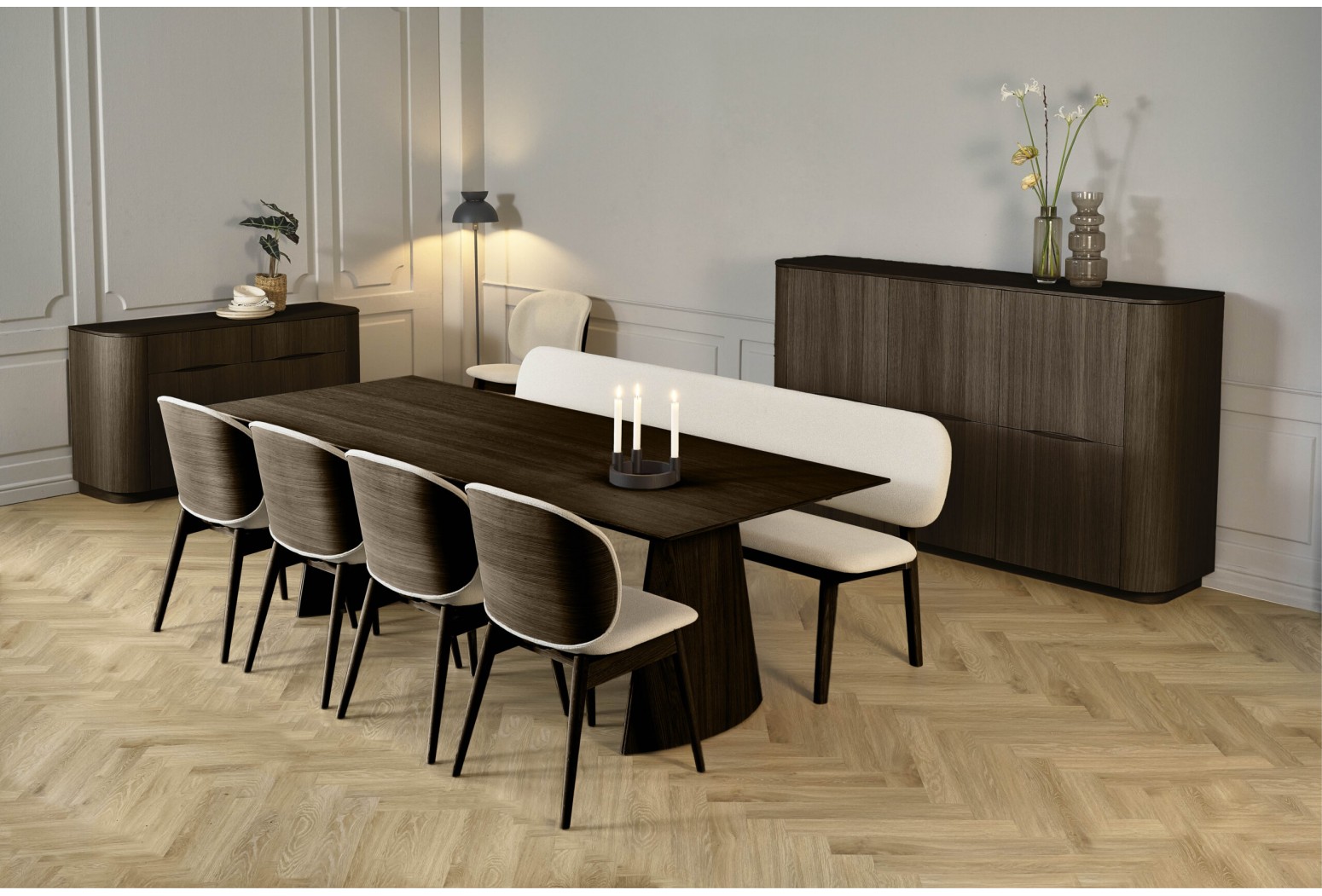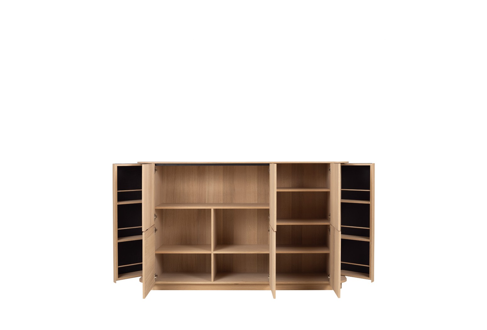 Příborníky, vysoké komody a vitríny Collum představují ucelenou řadu skříní v jemném organickém designu. Všechny skříňky mají na obou stranách přihrádku na nápoje/odkládací prostory s prohnutými dřevěnými dvířky opatřenými magnetickým zámkem.