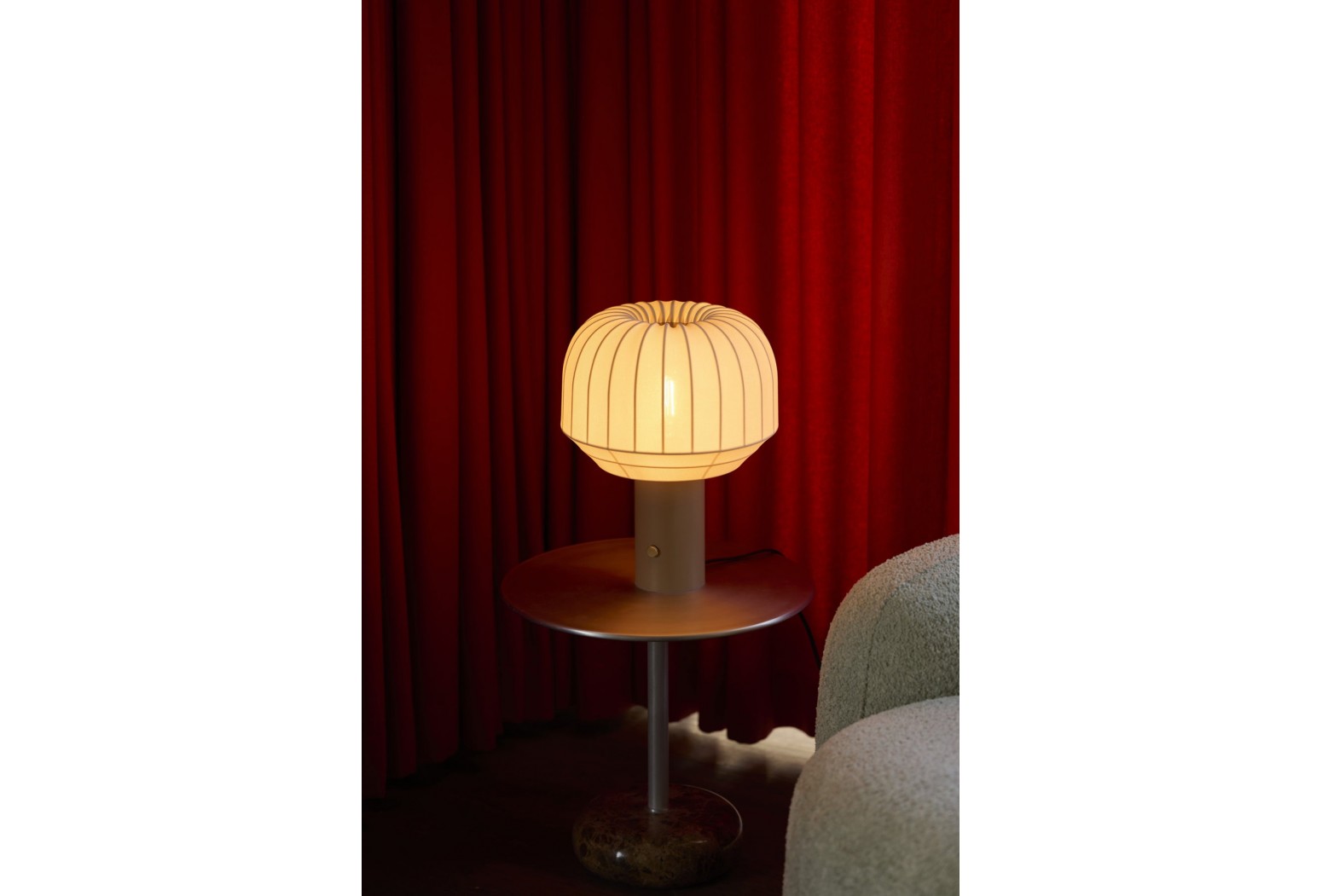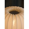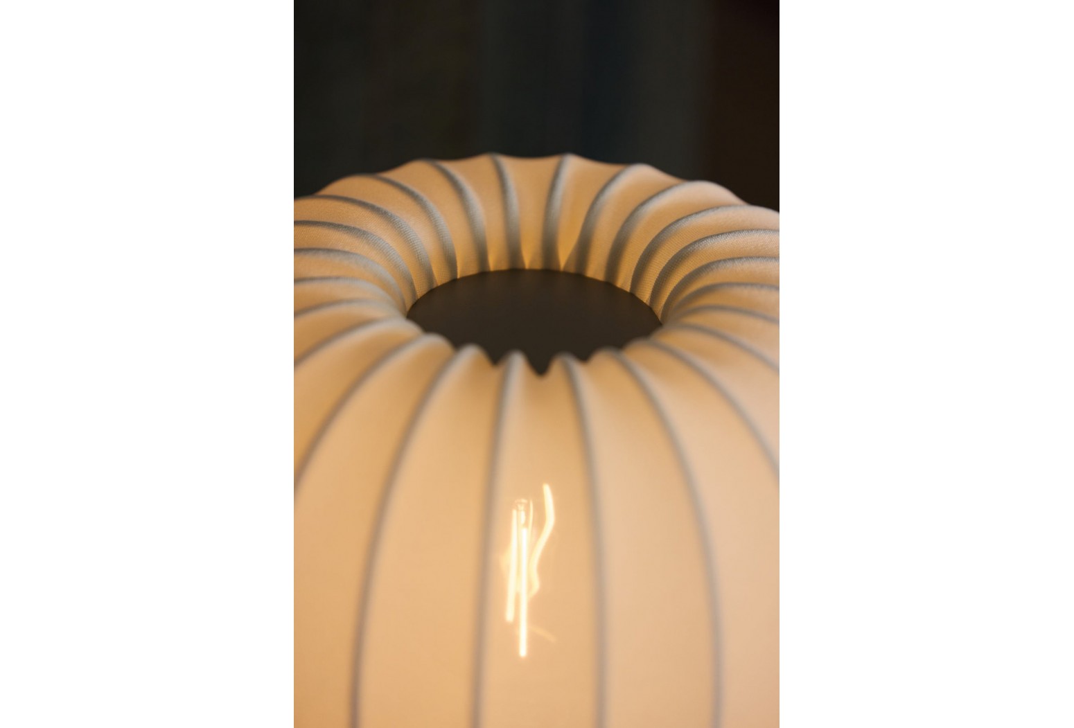 Každá lampa má jemně pletený krémově bílý polyesterový stínidlo pečlivě natažené přes bílý kovový rám, vytvářející hru měkkých textur a strukturovaných linií.