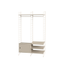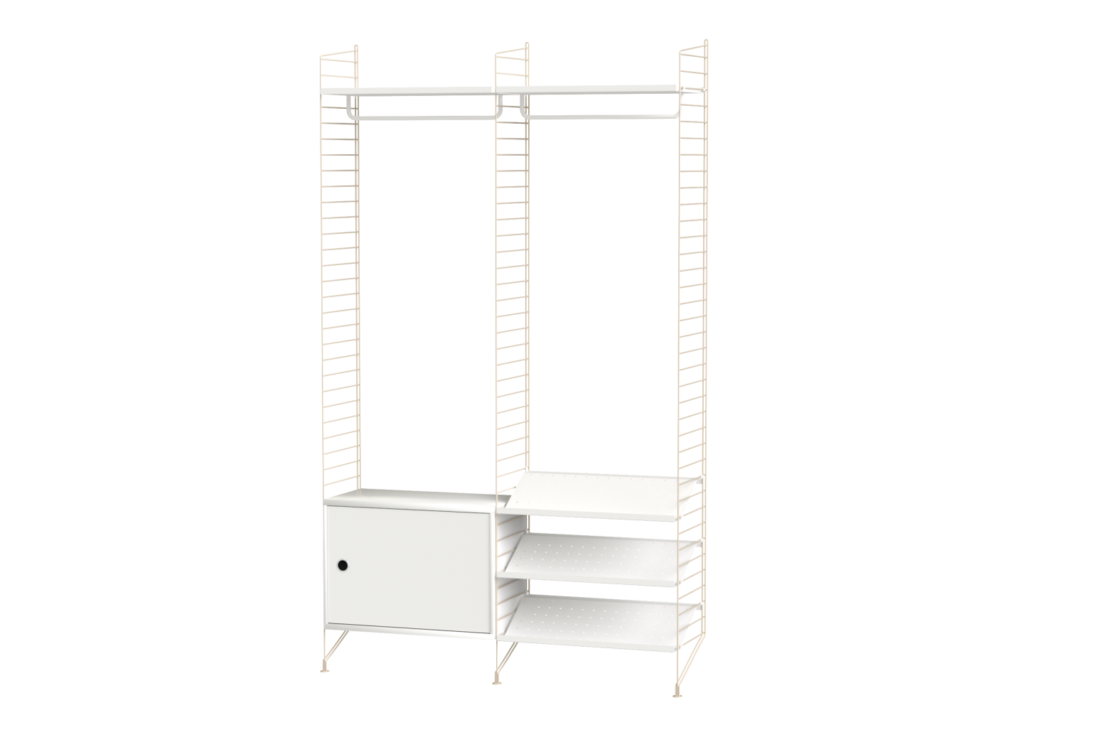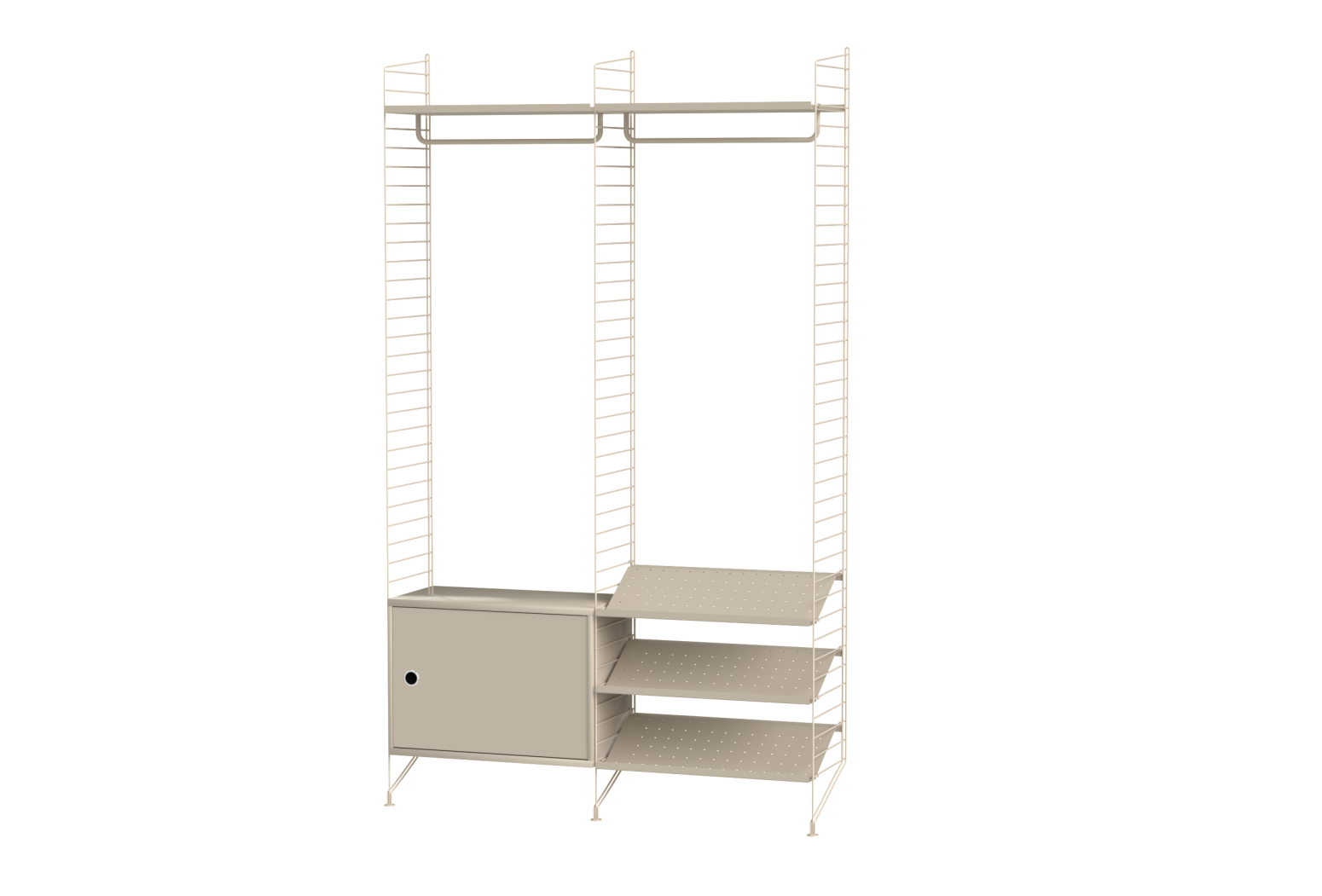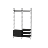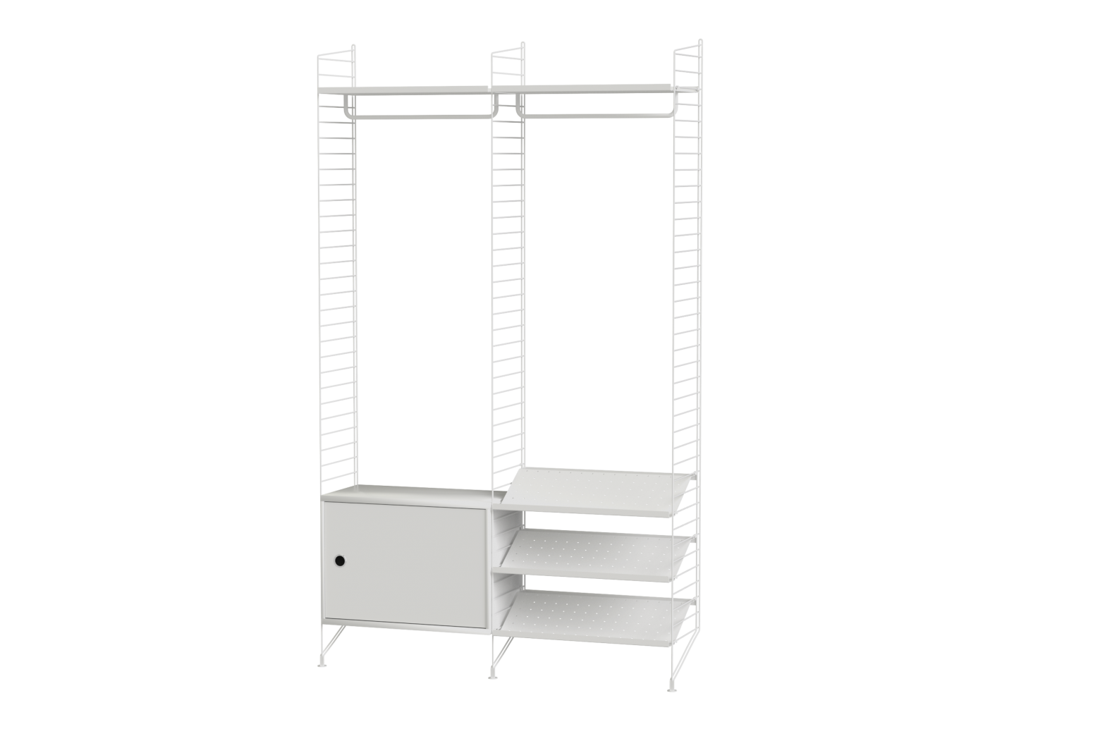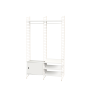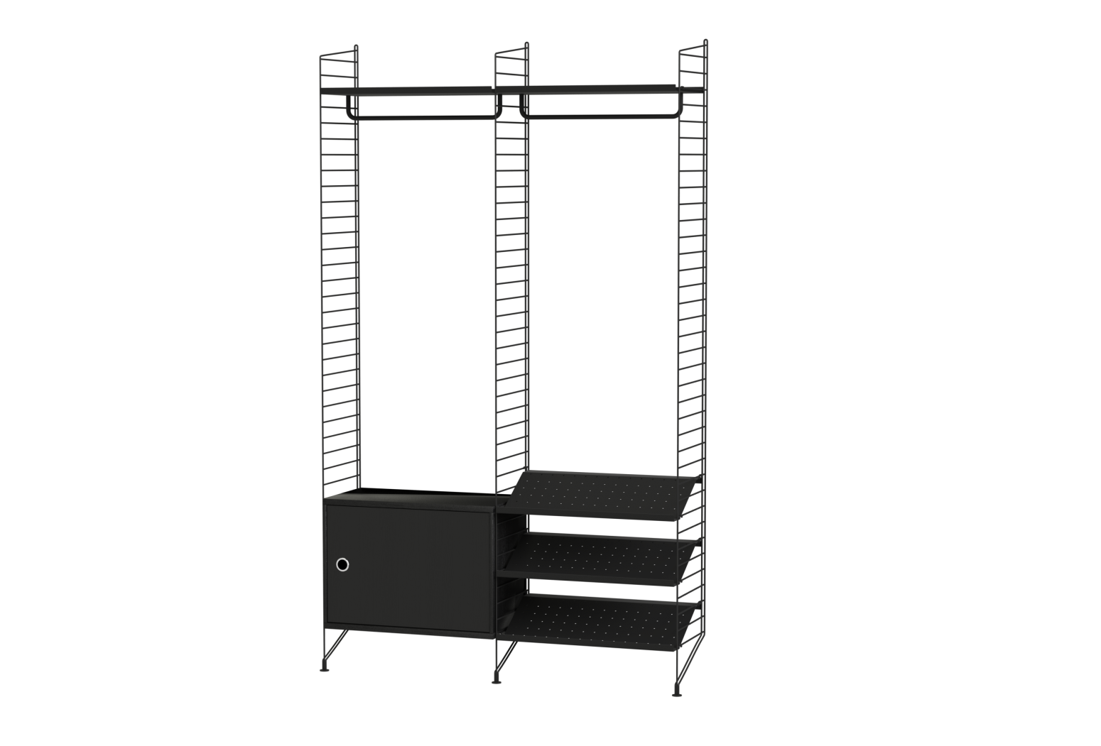 Připravená sestava ze systému String. Vhodná do předsíně. Kompletní soubor prvků dle zobrazení a soupisu. Z nabídky je možno vybrat materiálové provedení dřevěných částí a odstín lakování kovových stojek.