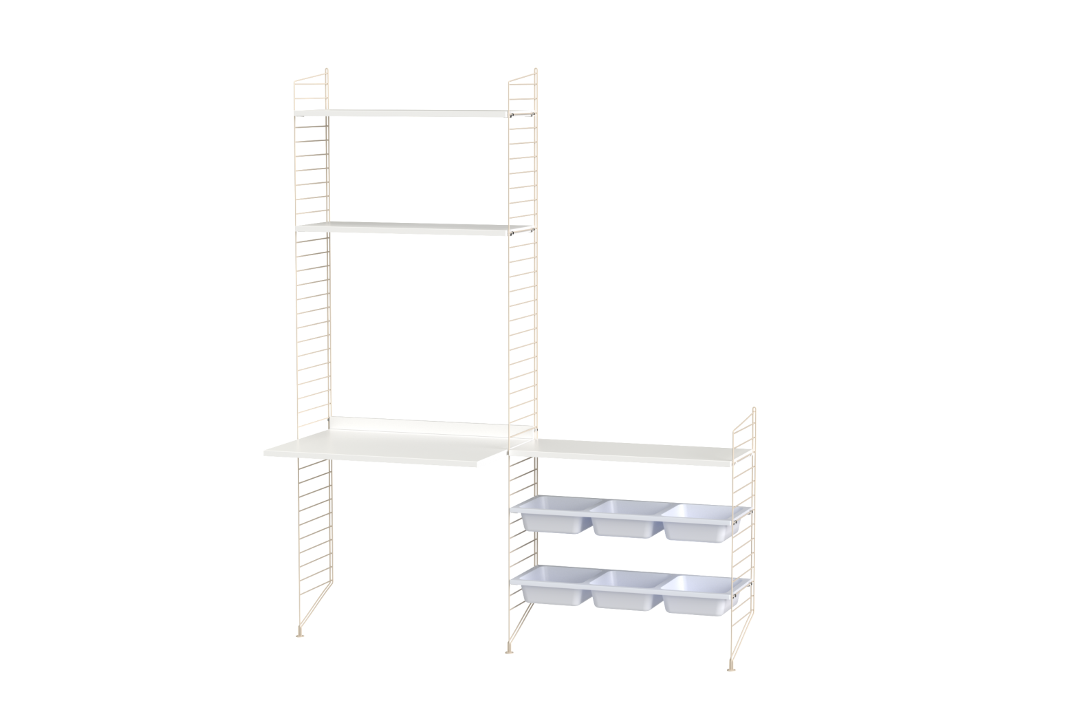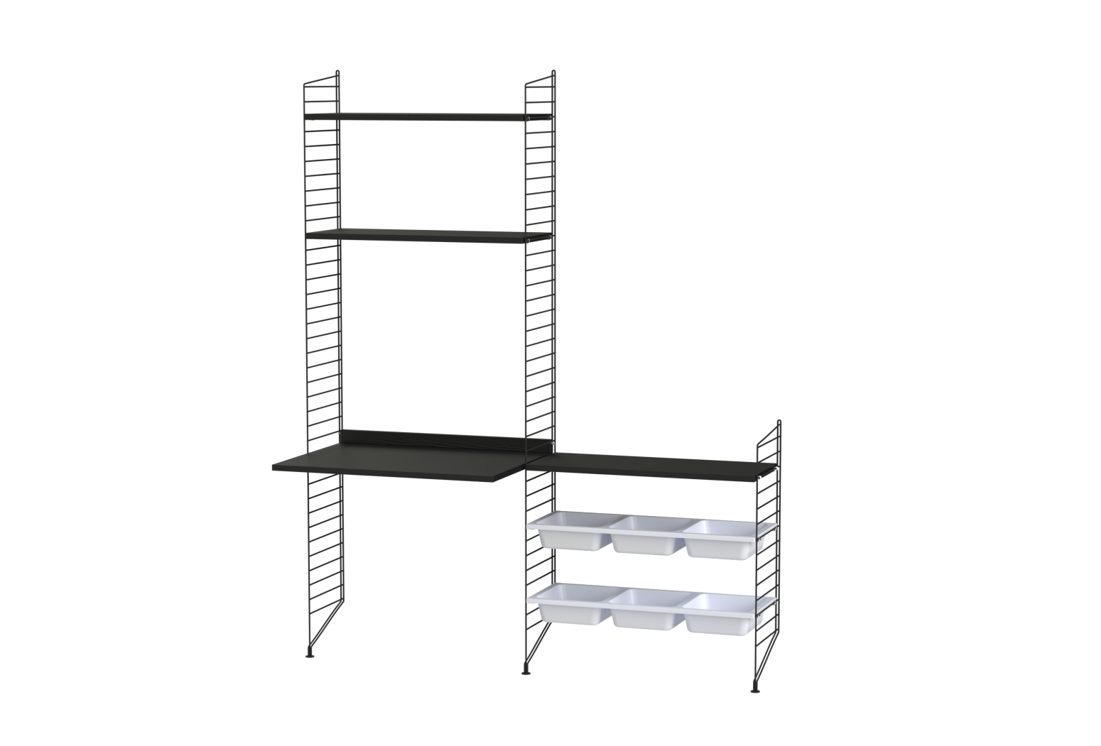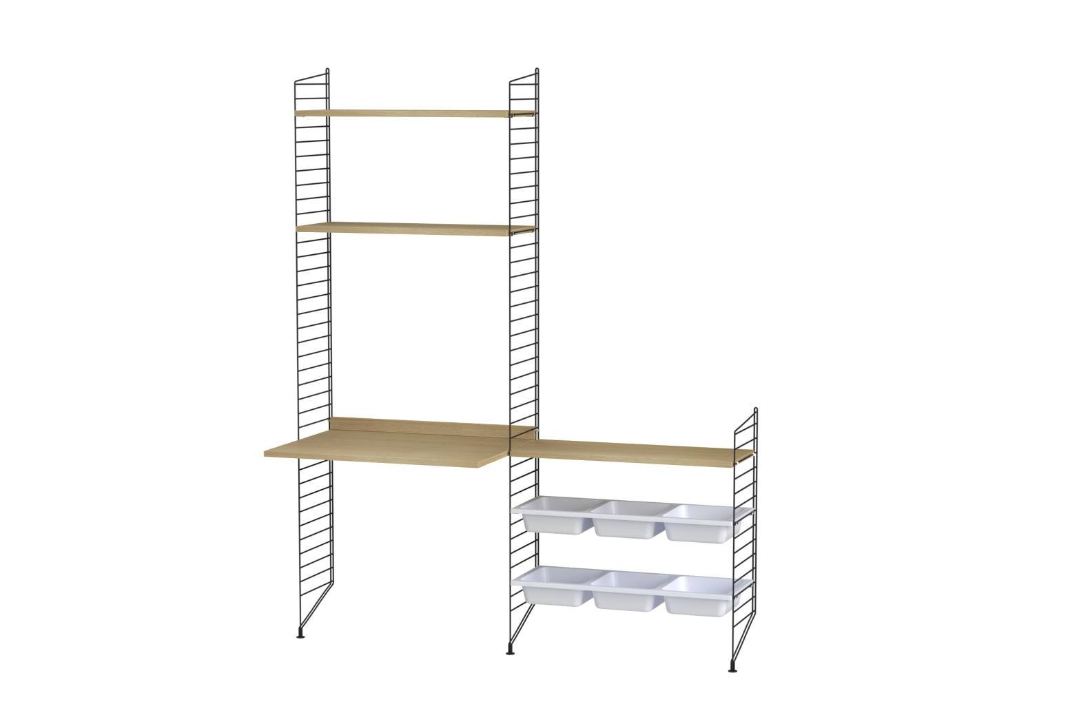 Připravená sestava ze systému String. Vhodná do dětského pokoje. Kompletní soubor prvků dle zobrazení a soupisu. Z nabídky je možno vybrat materiálové provedení dřevěných částí a odstín lakování kovových stojek.