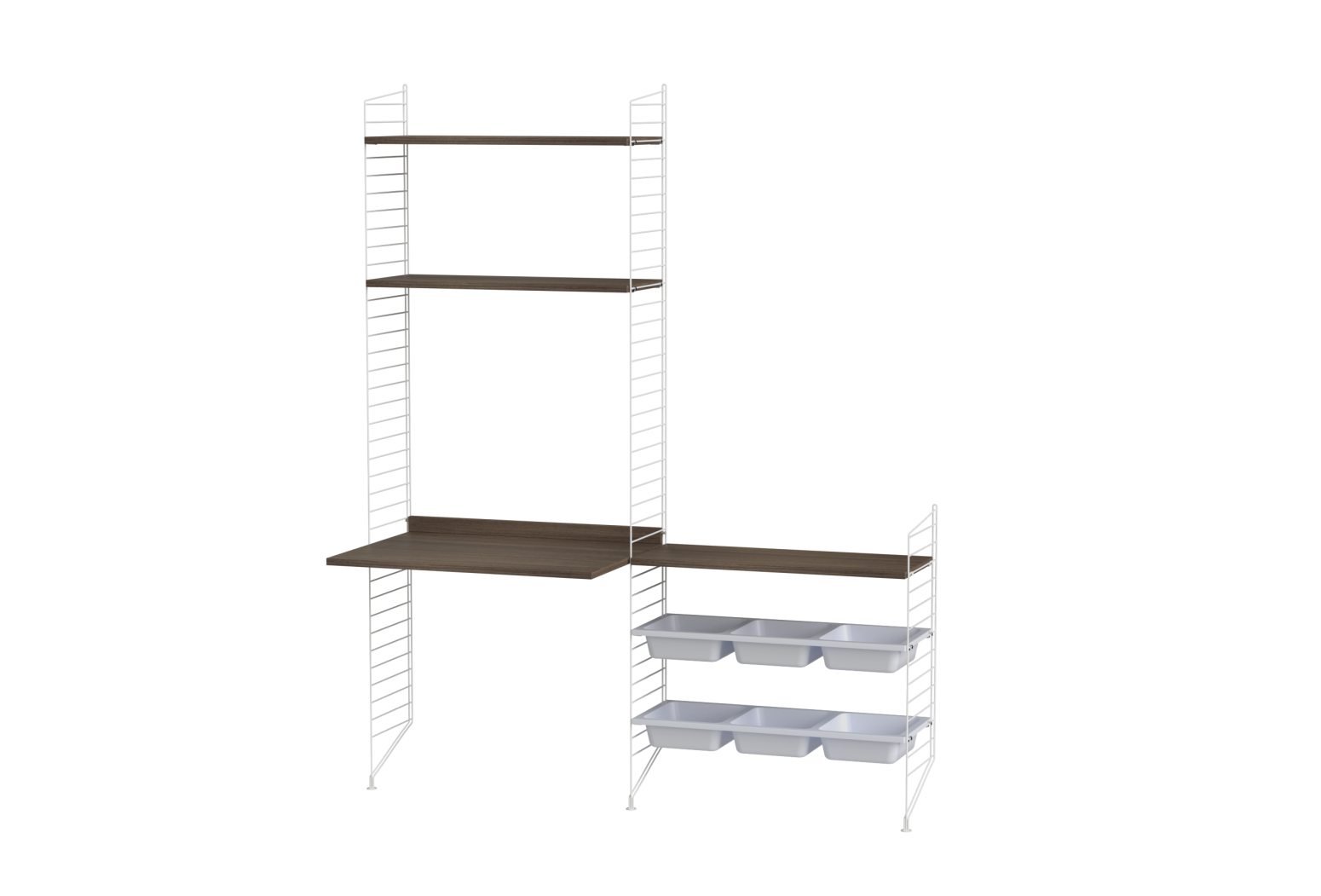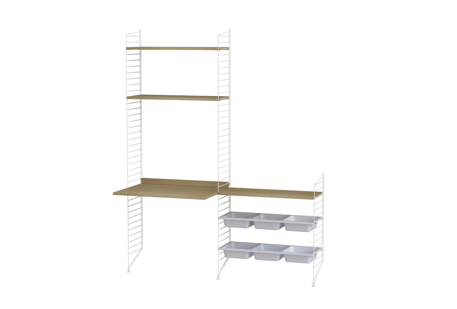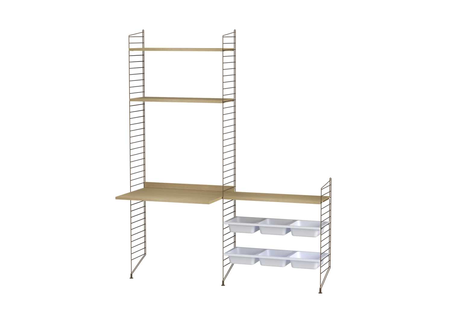 Připravená sestava ze systému String. Vhodná do dětského pokoje. Kompletní soubor prvků dle zobrazení a soupisu. Z nabídky je možno vybrat materiálové provedení dřevěných částí a odstín lakování kovových stojek.