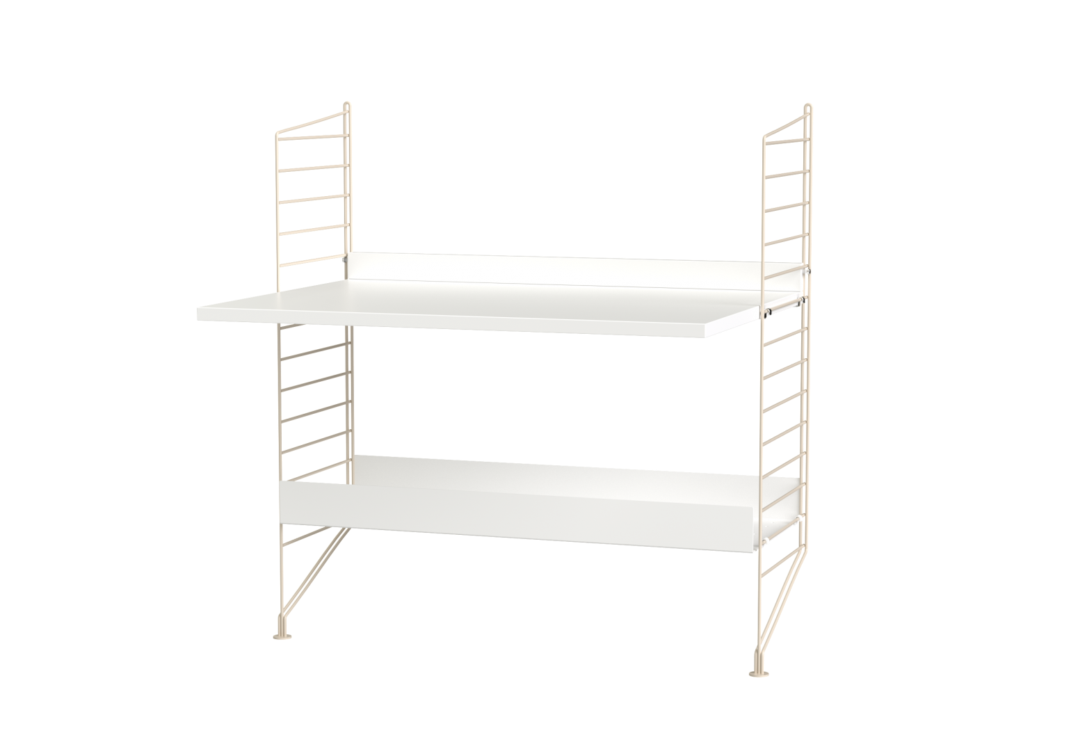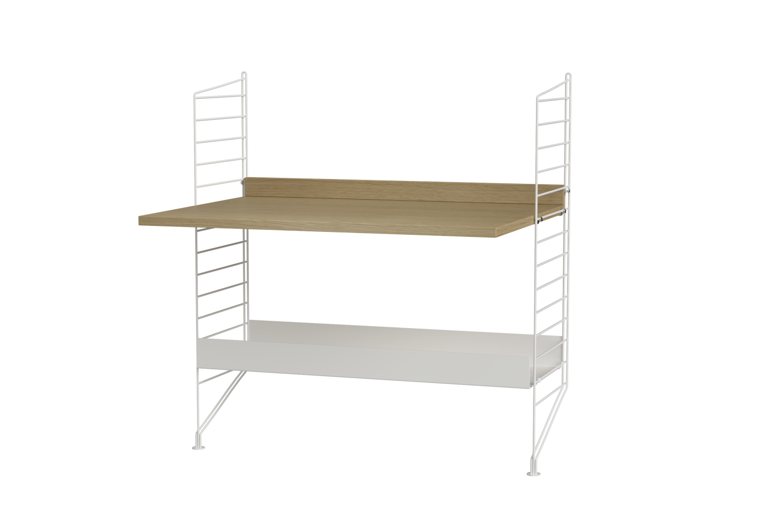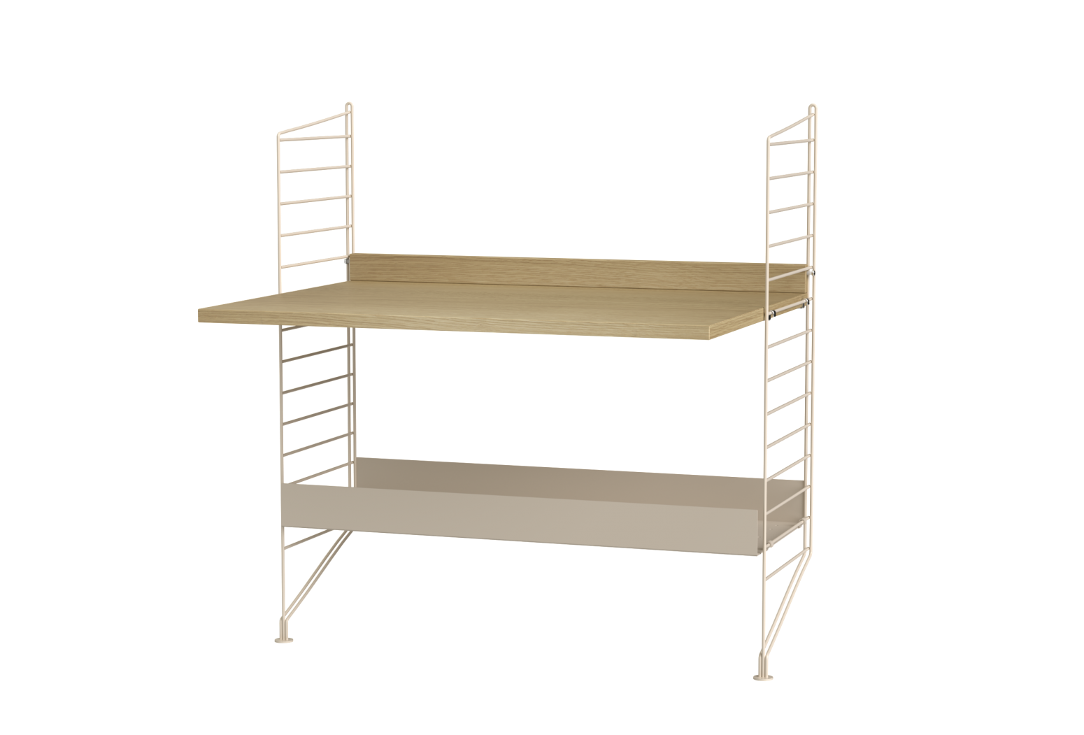 Připravená sestava ze systému String. Vhodná do dětského pokoje. Kompletní soubor prvků dle zobrazení a soupisu. Z nabídky je možno vybrat materiálové provedení dřevěných částí a odstín lakování kovových stojek.