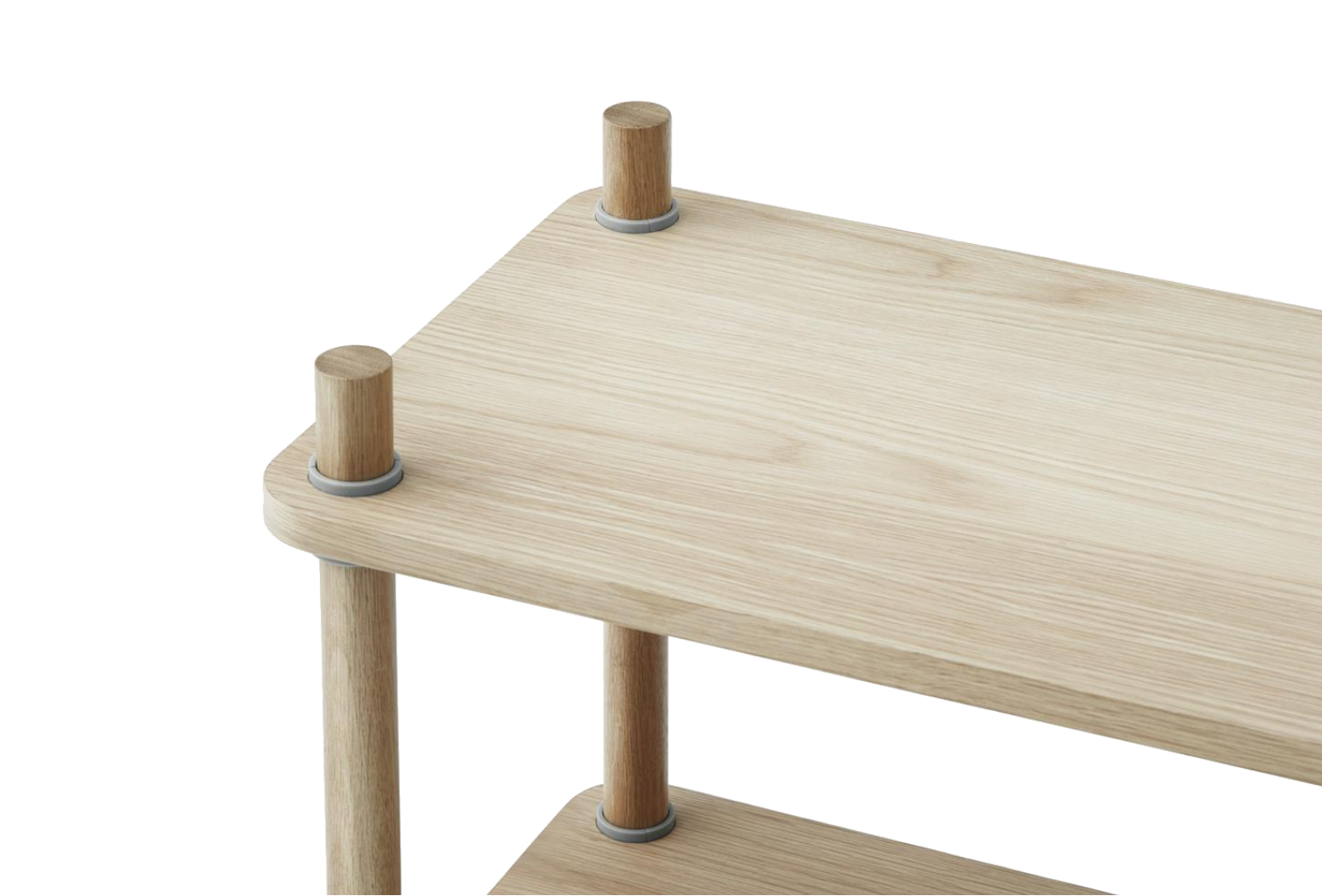 Knihovna Jam je k dispozici v různých velikostech a lze ji umístit ke zdi nebo použít jako rozdělovač místností. Měkce zaoblené rohy polic dávají jednotce příjemný a přátelský vizuální výraz. Díky svému univerzálnímu designu funguje knihovna stejně dobře v malých bytech i ve velkých kancelářích, kde její čistota a materiálnost působí uklidňujícím a příjemným dojmem.