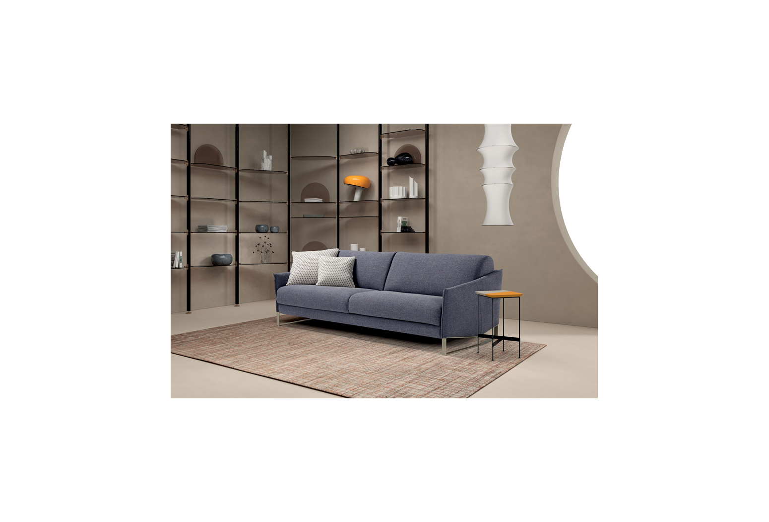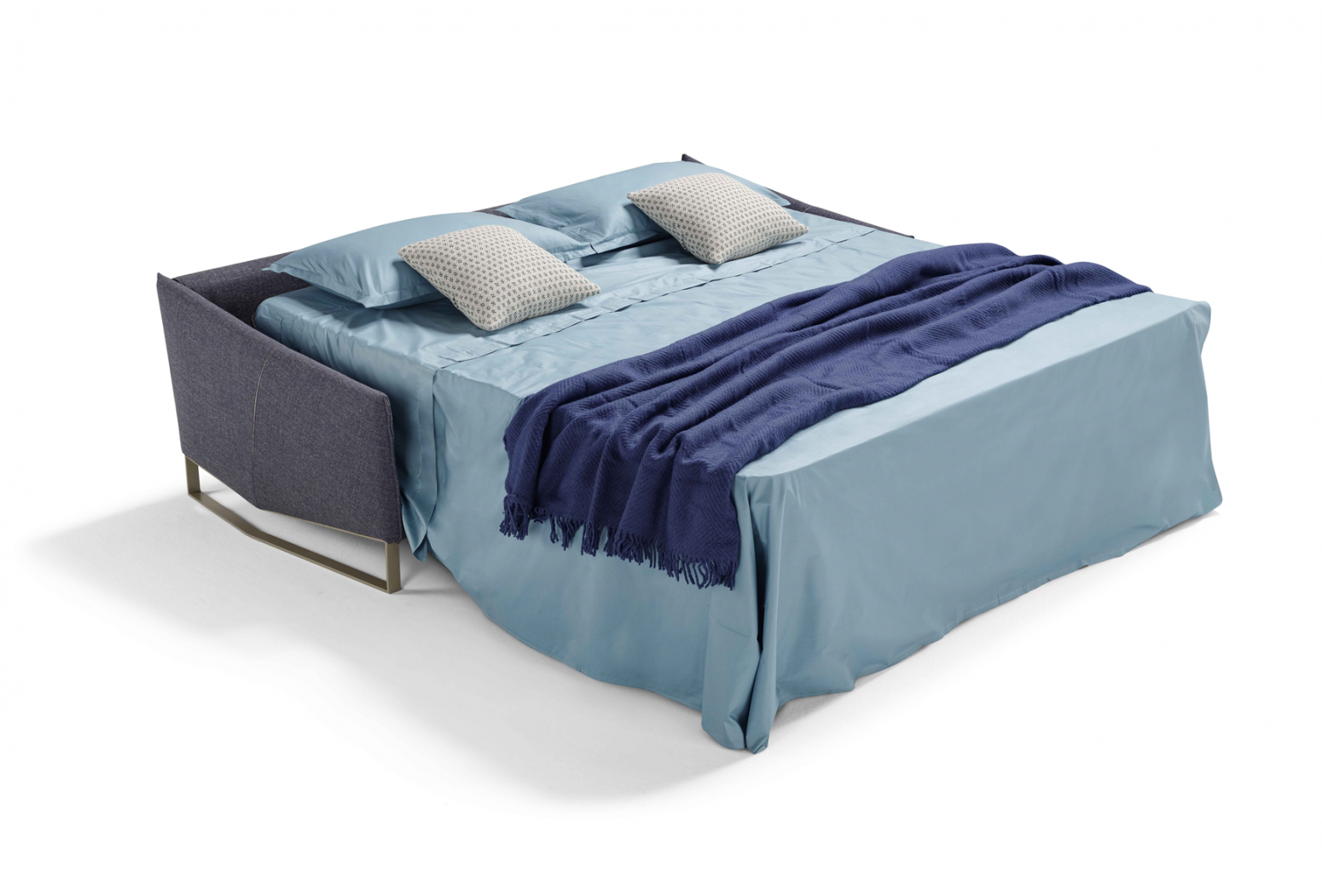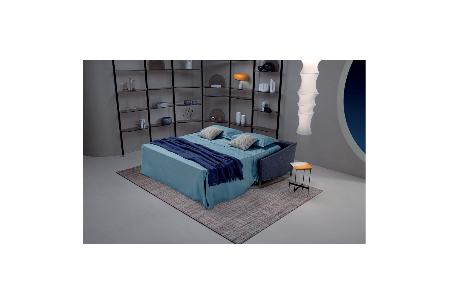 Rozkládací pohovka. Mechanismus: standardní kovový rošt. Konstrukce: smíšené dřevo (překližka a masivní dřevo) Standardní matrace: strečový polyuretan, hl.30 h 13 cm. Hustota sedáku: horní část 50 kg/m3 paměťová pěna, spodní část 30 kg/m3. Hustota opěradla: 25 kg/m3. Nohy: H 13 cm, dostupné v různých kovových povrchových úpravách. Volitelně: matrace, dřevěné rošty. Čalounění: kompletně snímatelný potah. Dva polštáře Model D24 ve stejné barvě a kategorii jako pohovka. K dispozici ve verzi bez postele.