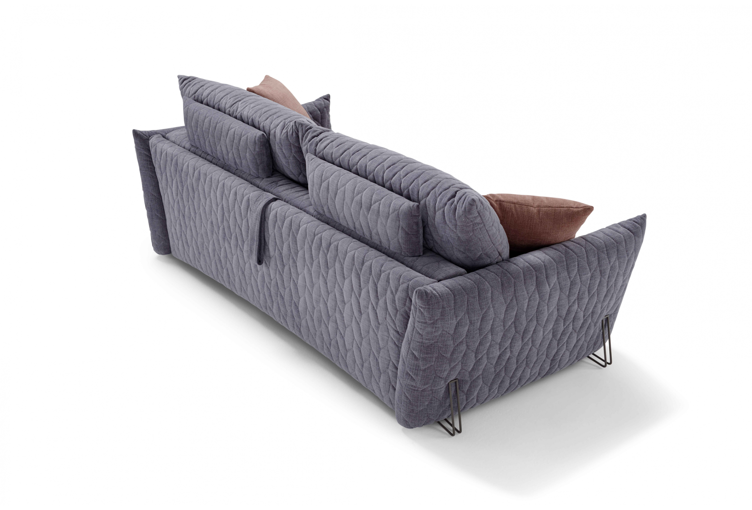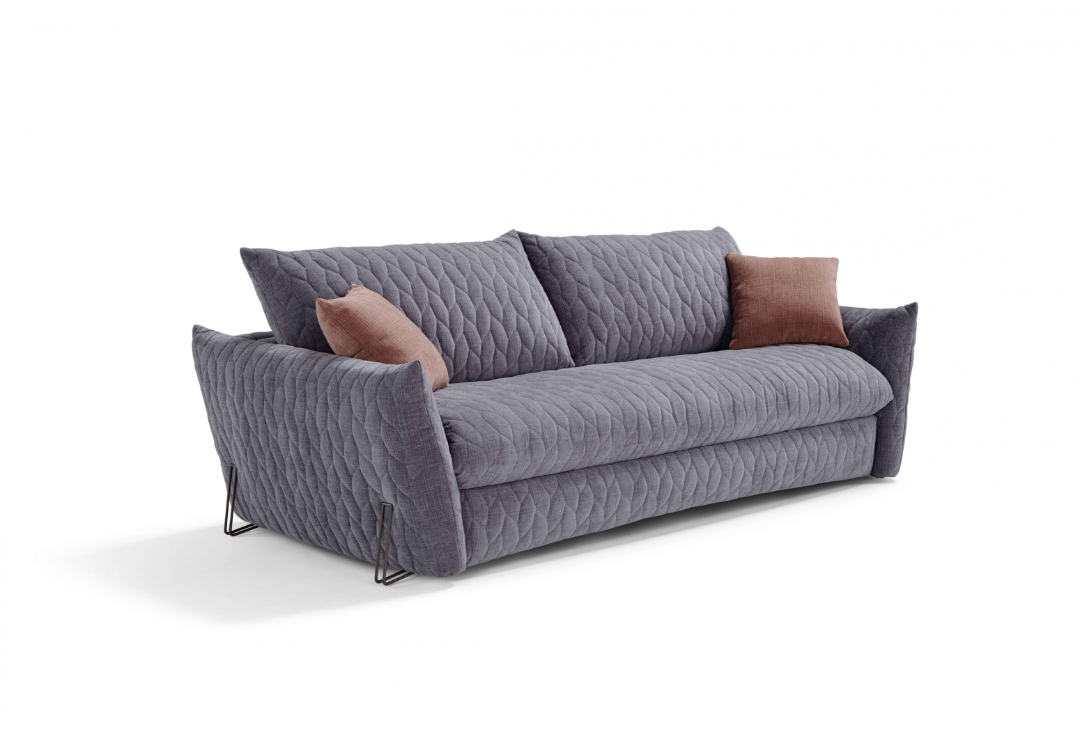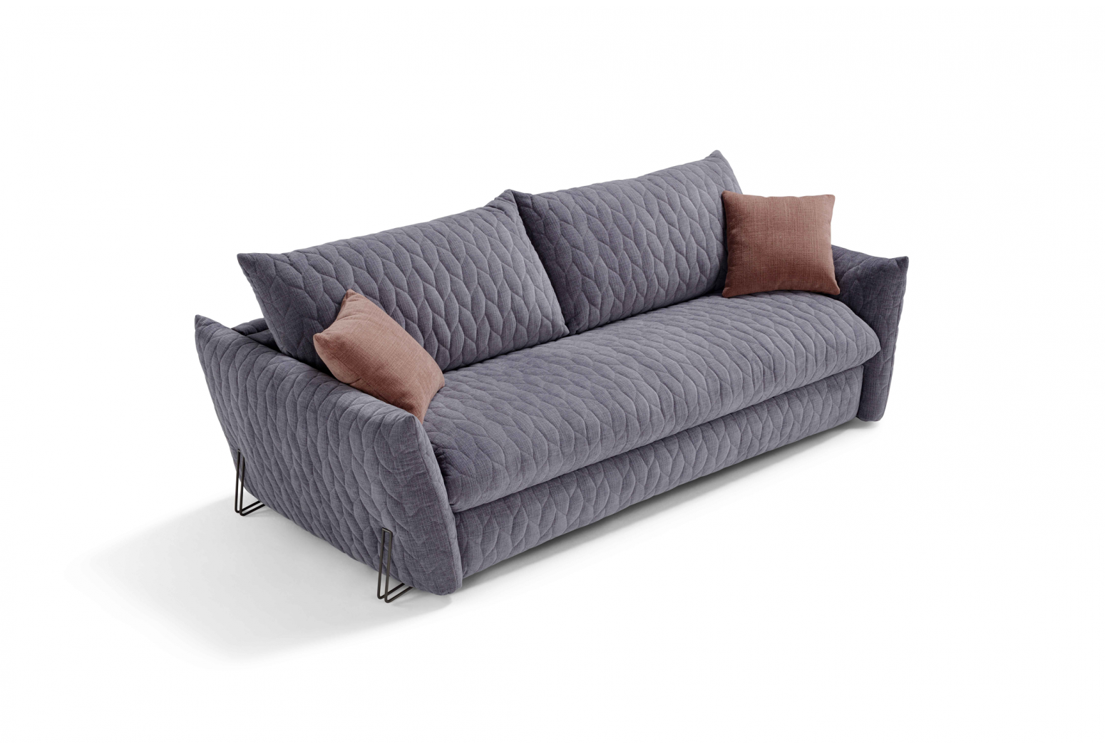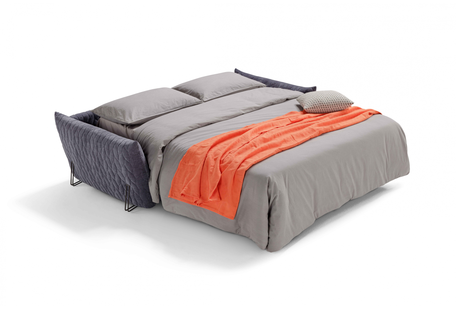 Rozkládací prošívaná pohovka. Mechanismus: standardní kovový rošt. Konstrukce: smíšené dřevo (překližka a masivní dřevo). Standardní matrace: strečový polyuretan D.30 h 13 cm. Hustota sedáku: horní část z husího peří, spodní část 35 kg/m3. Hustota opěradla: v husím peří. Nohy: dostupné v různých kovových povrchových úpravách. Volitelně: matrace, dřevěné rošty a spací mechanismus s kolečky. * (Paměťové a 2 pěnové matrace jsou dostupné pouze pro model s kovovým roštem). Čalounění: prošívaný, snímatelný látkový potah. Prošívání lze vyžádat u všech dostupných látek kromě referencí „Maracaibo Geometrico“ a „Nuvole Fantasia“. Dva polštáře Model D24 ve stejné barvě a kategorii jako pohovka (neprošívané). K dispozici ve verzi bez postele.