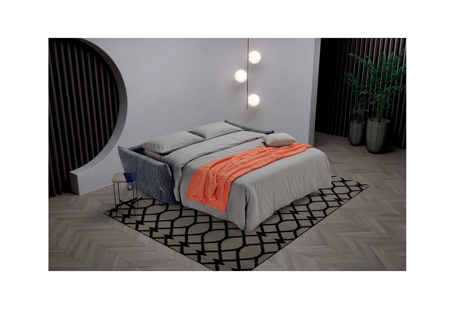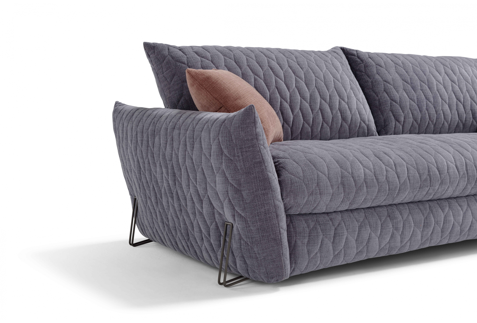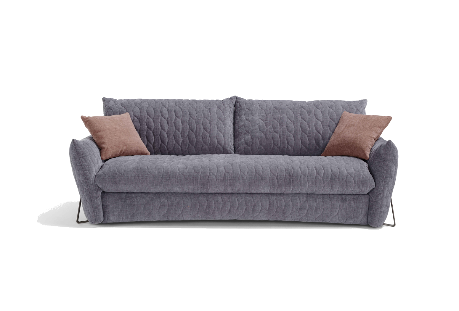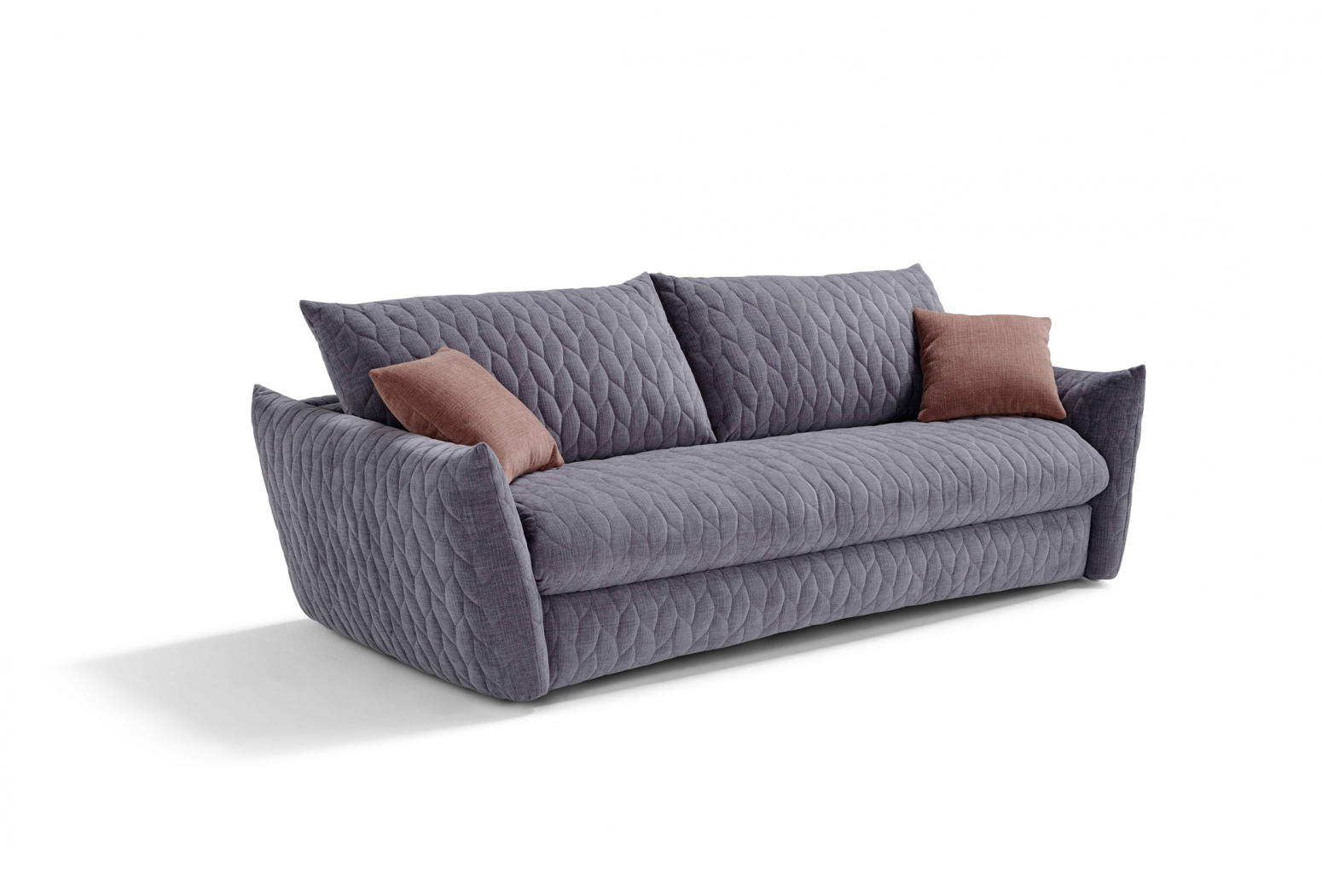 Rozkládací prošívaná pohovka. Mechanismus: standardní kovový rošt. Konstrukce: smíšené dřevo (překližka a masivní dřevo). Standardní matrace: strečový polyuretan D.30 h 13 cm. Hustota sedáku: horní část z husího peří, spodní část 35 kg/m3. Hustota opěradla: v husím peří. Nohy: dostupné v různých kovových povrchových úpravách. Volitelně: matrace, dřevěné rošty a spací mechanismus s kolečky. * (Paměťové a 2 pěnové matrace jsou dostupné pouze pro model s kovovým roštem). Čalounění: prošívaný, snímatelný látkový potah. Prošívání lze vyžádat u všech dostupných látek kromě referencí „Maracaibo Geometrico“ a „Nuvole Fantasia“. Dva polštáře Model D24 ve stejné barvě a kategorii jako pohovka (neprošívané). K dispozici ve verzi bez postele.