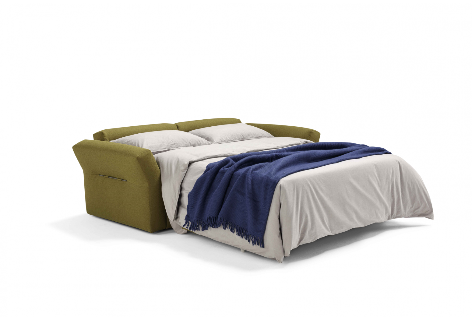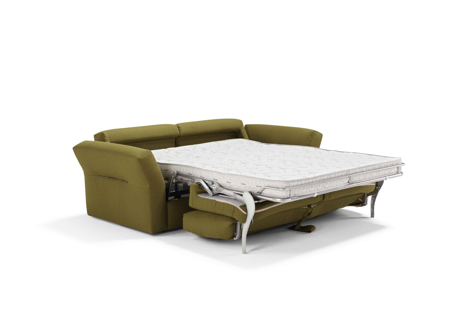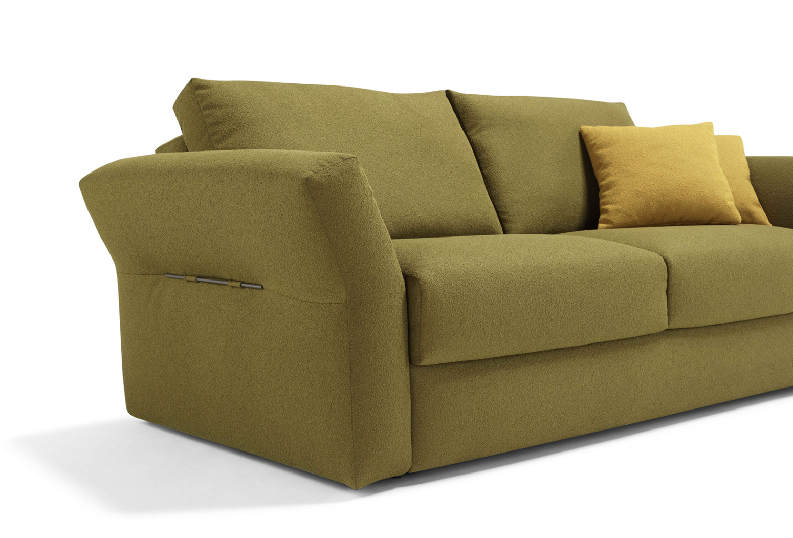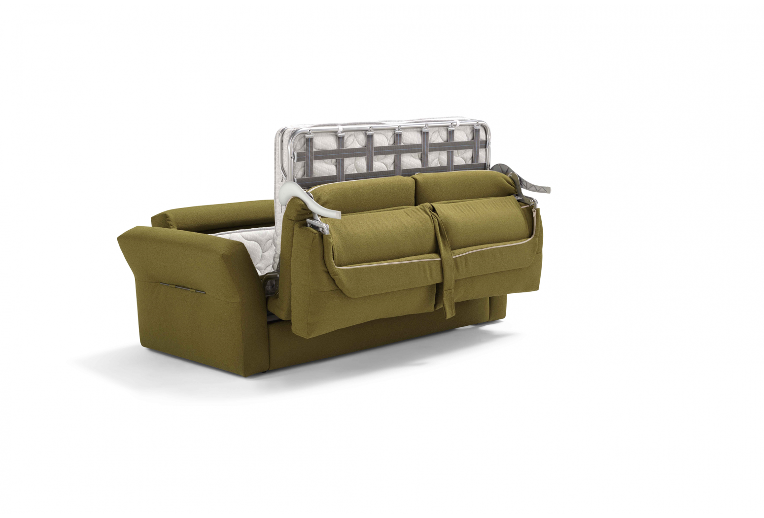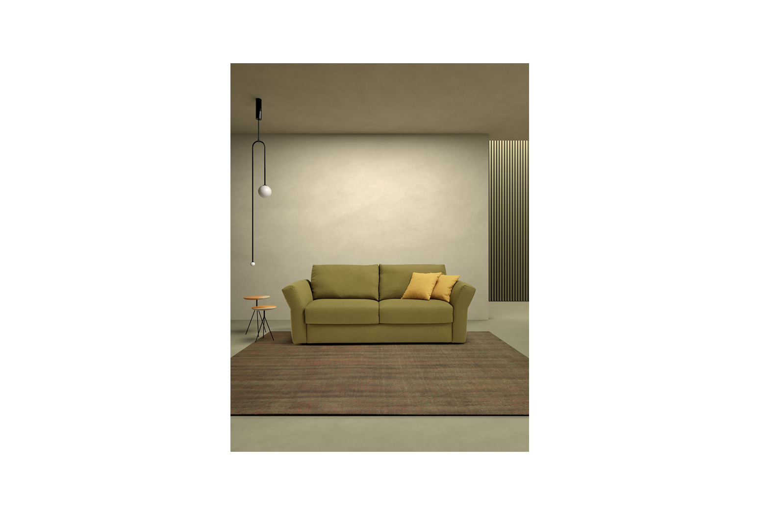 Rozkládací pohovka. Mechanismus: standardní kovový rošt. Konstrukce: smíšené dřevo (překližka a masivní dřevo). Standardní matrace: strečový polyuretan D.30 h 13 cm. Hustota sedáku: 35 kg/m3. Opěradlo: směs peří. Nohy: černý plast. Kovová vložka: k dispozici v různých povrchových úpravách. Volitelně: matrace, dřevěné rošty, spací mechanismus s válečkovým systémem. Čalounění: kompletně snímatelný potah. Dva polštáře Model D24 ve stejné barvě a kategorii jako pohovka. K dispozici ve verzi bez postele.