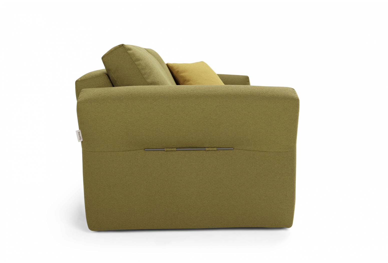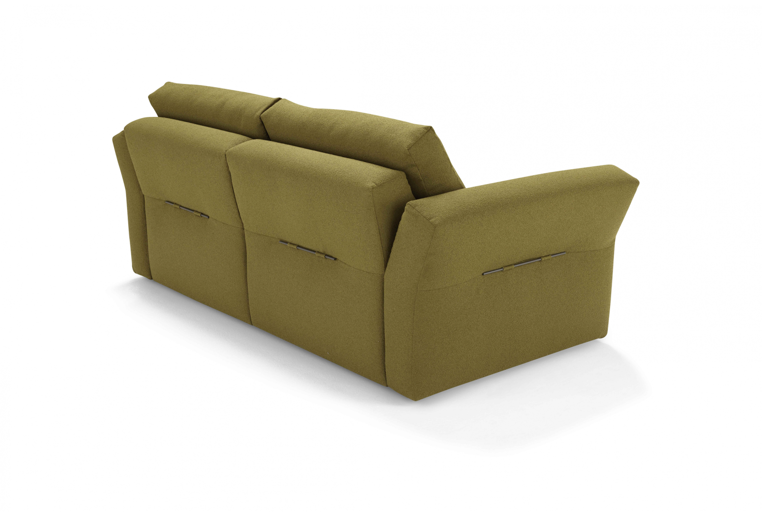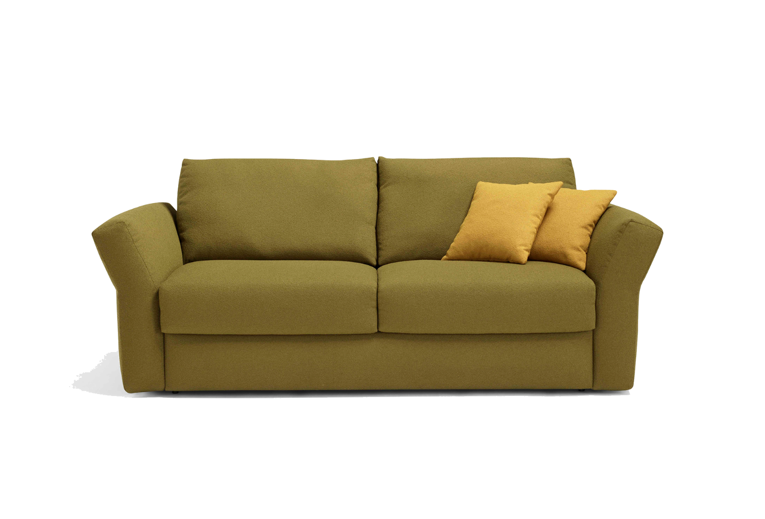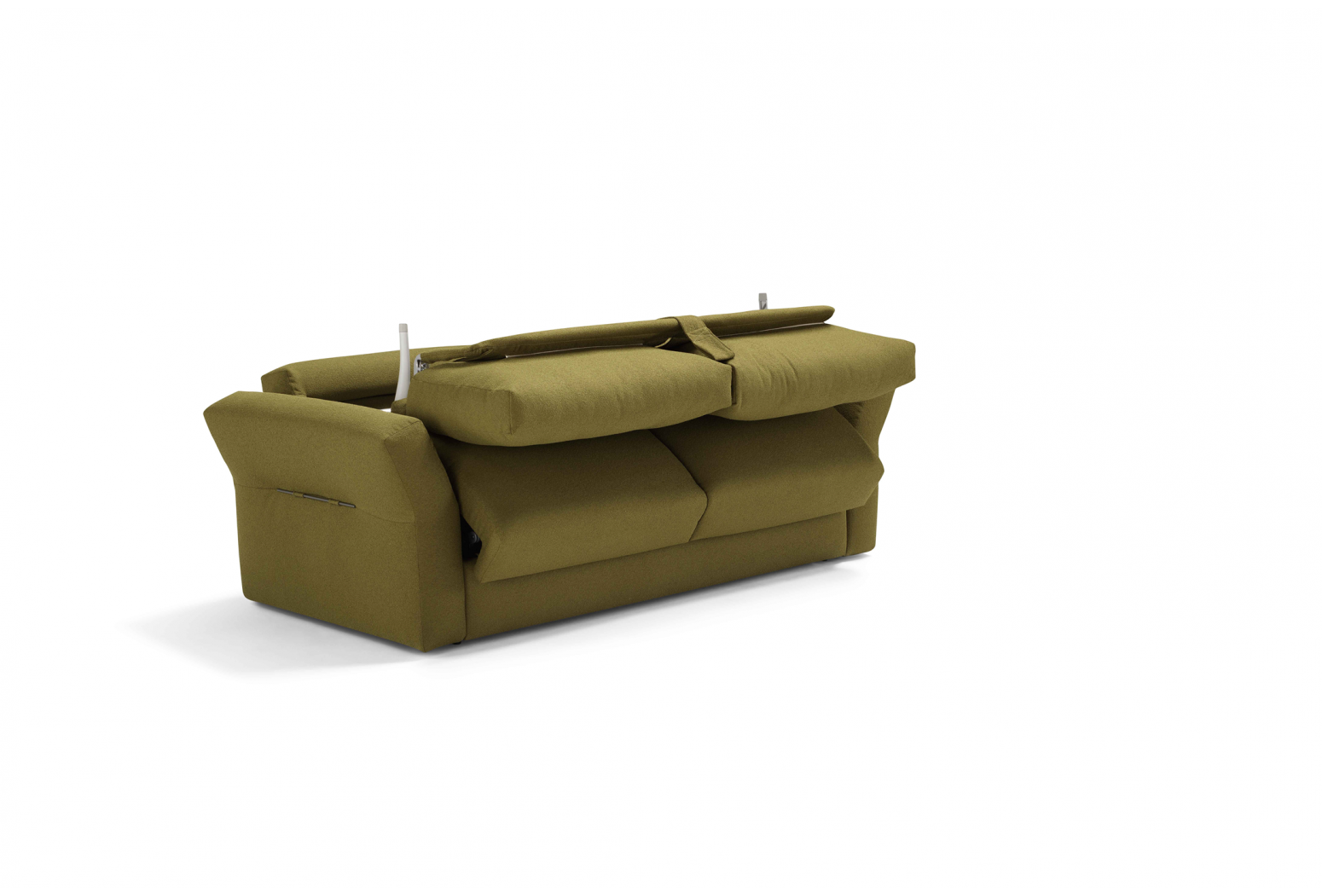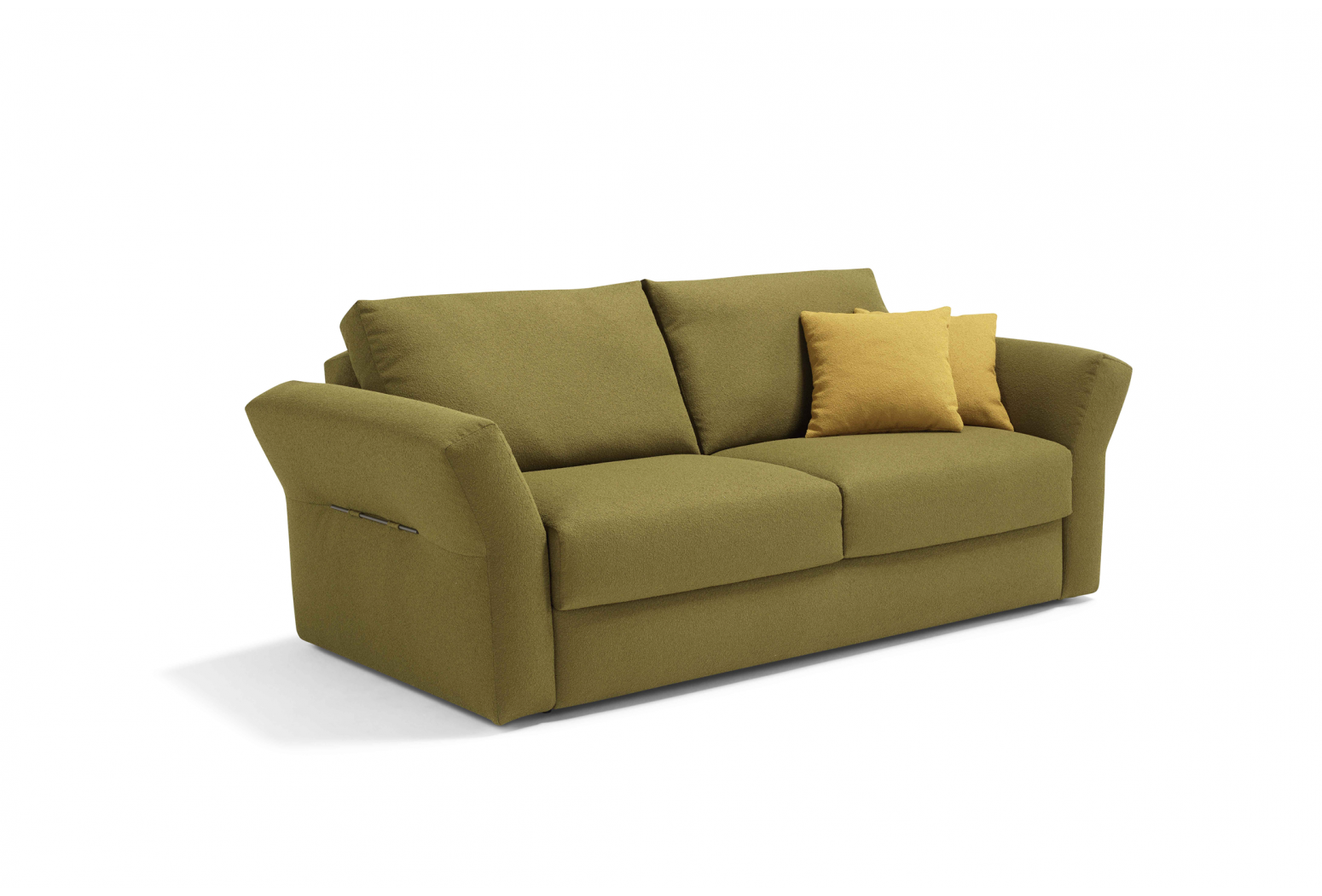 Rozkládací pohovka. Mechanismus: standardní kovový rošt. Konstrukce: smíšené dřevo (překližka a masivní dřevo). Standardní matrace: strečový polyuretan D.30 h 13 cm. Hustota sedáku: 35 kg/m3. Opěradlo: směs peří. Nohy: černý plast. Kovová vložka: k dispozici v různých povrchových úpravách. Volitelně: matrace, dřevěné rošty, spací mechanismus s válečkovým systémem. Čalounění: kompletně snímatelný potah. Dva polštáře Model D24 ve stejné barvě a kategorii jako pohovka. K dispozici ve verzi bez postele.