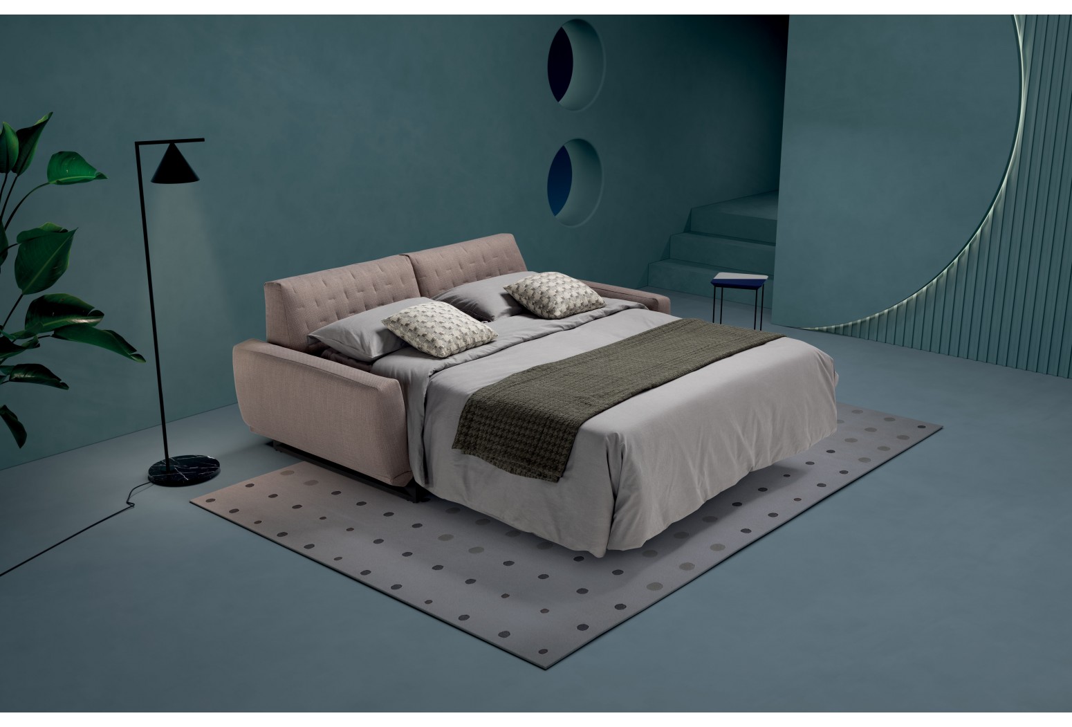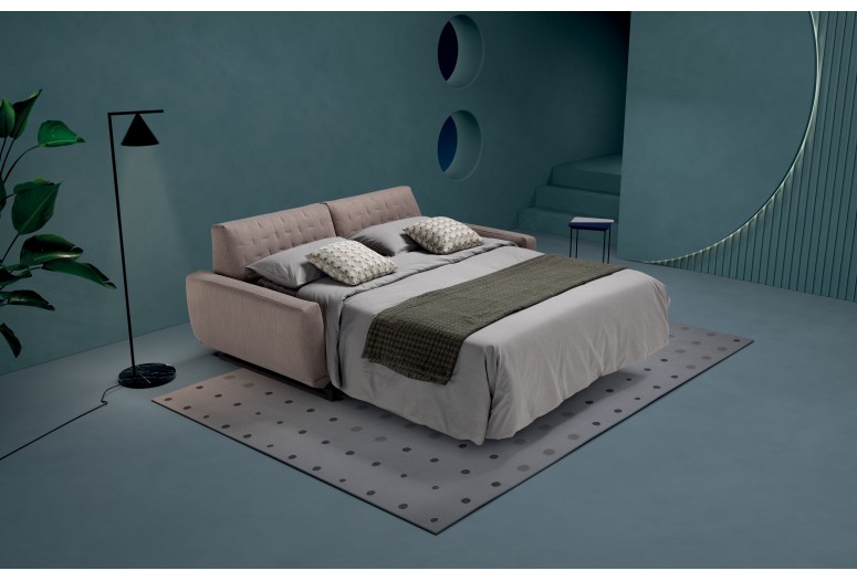 Rozkládací prošívaná rozkládací pohovka. Mechanismus: standardní elektricky svařovaná síťovina. Konstrukce: smíšené dřevo (překližka a masivní dřevo). Opěradlo lze nastavit do dvou hloubek sedáku. Standardní matrace: strečový polyuretan, průměr 30 cm, výška 16 cm. Hustota sedáku: horní část 30 kg/m3, spodní část 30 kg/m3. Hustota opěradla: 24 kg/m3. Nohy: výška 8 cm, dostupné v různých kovových povrchových úpravách. Volitelné: matrace. Čalounění: prošívané, snímatelný látkový potah. Prošívání lze objednat pro všechny dostupné látky s výjimkou látek „Maracaibo Geometrico“ a „Nuvole Fantasia“. Dva polštáře modelu D24 ve stejné barvě a kategorii jako pohovka (jednobarevné). K ​​dispozici ve verzi bez postele.