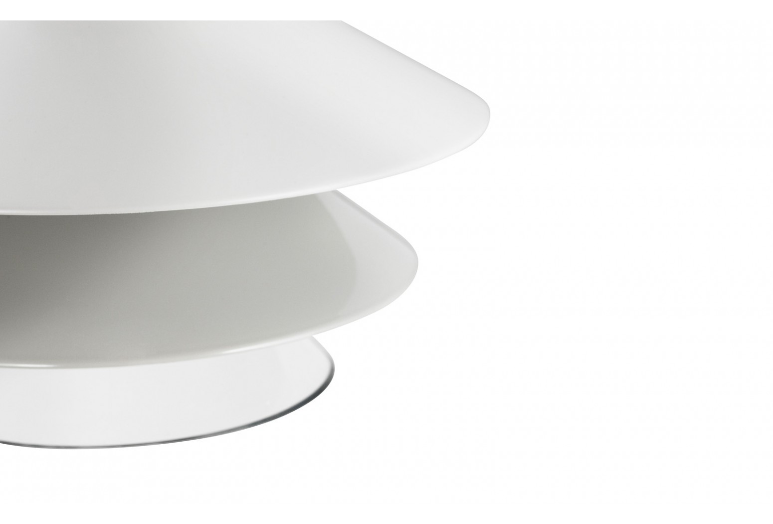 Světlo je směrováno horním stínidlem, zatímco spodní stínítko zajišťuje neoslnění. Dodáváno se 4 m textilní šňůrou a armaturou v odpovídající barvě. Součástí je bílý stropní kalíšek.