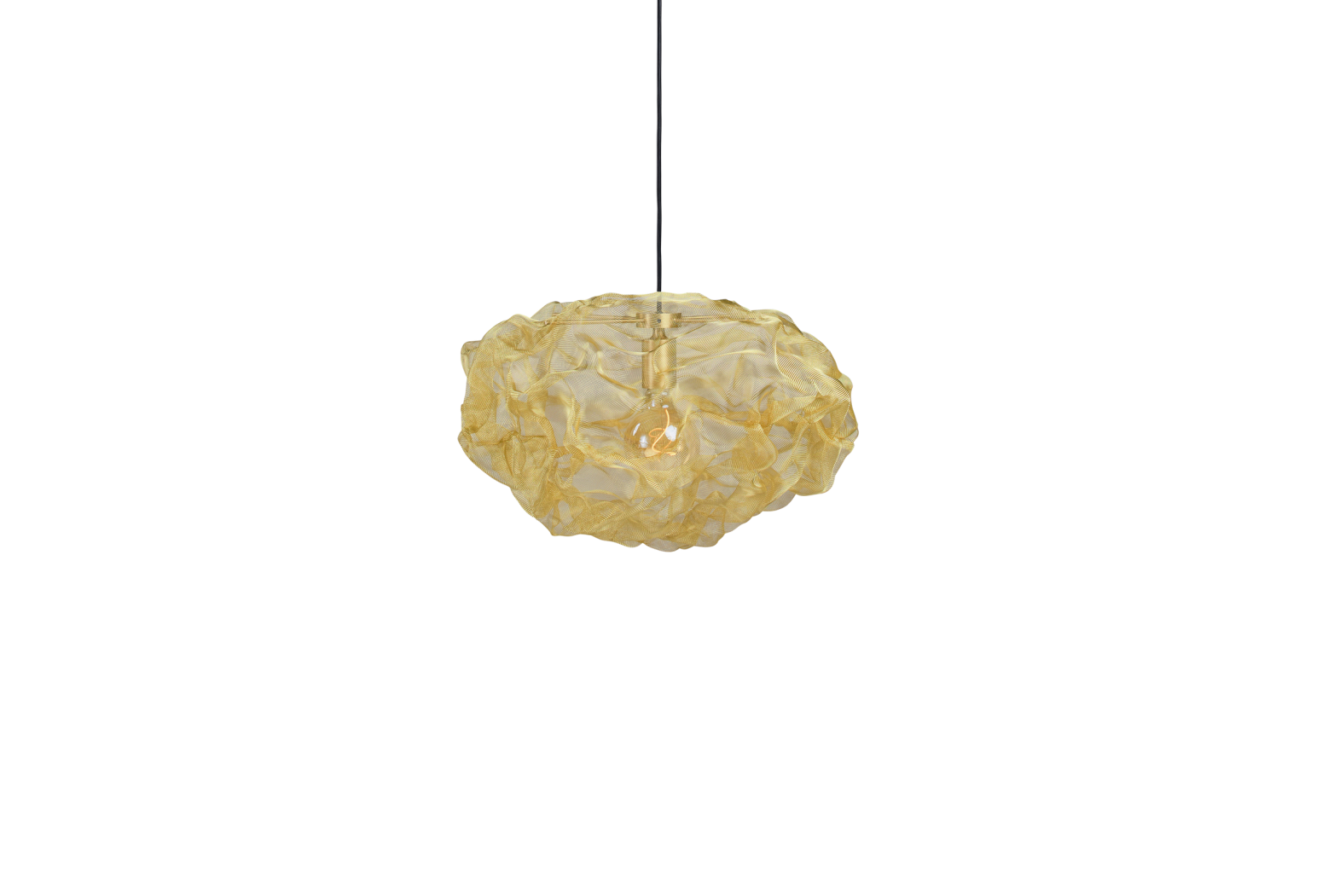 Lesklá mosazná síťka byla výchozím bodem pro tuto závěsnou lampu, kterou návrhář umělecky proměnil v zářící oblak ohně. Jakmile se světlo zhasne, 'oheň' zmizí a stín vypadá zakaleně. Teplo vzniklo z designérových experimentů s kolidujícími materiály a inspirace vytvořit velké závěsné světlo charakterizované kontrasty.