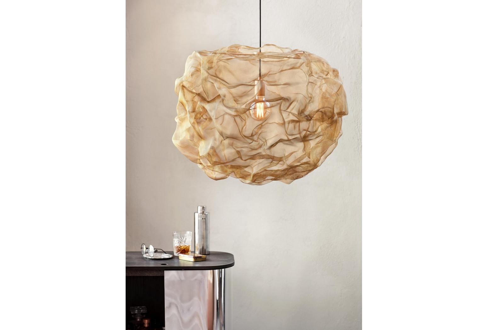 Lesklá mosazná síťka byla výchozím bodem pro tuto závěsnou lampu, kterou návrhář umělecky proměnil v zářící oblak ohně