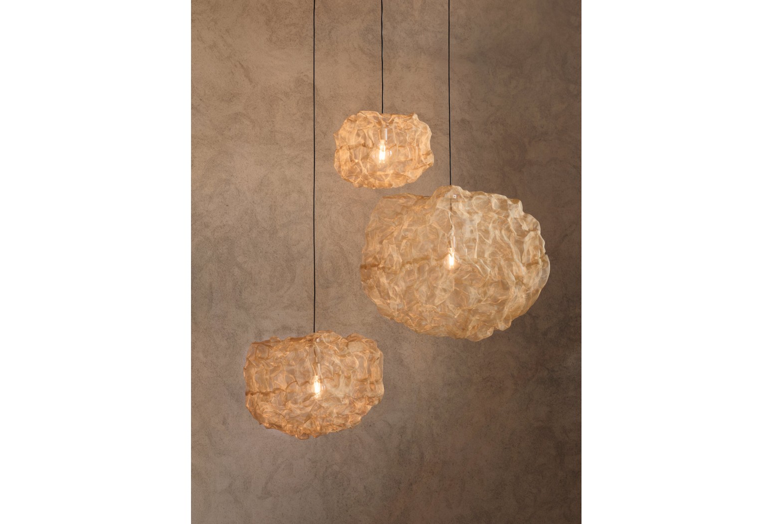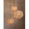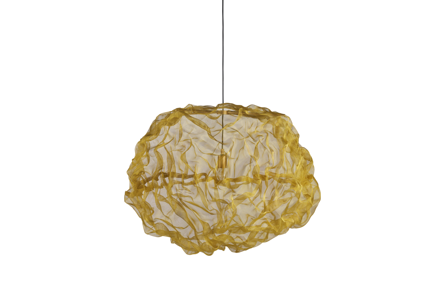Lesklá mosazná síťka byla výchozím bodem pro tuto závěsnou lampu, kterou návrhář umělecky proměnil v zářící oblak ohně. Jakmile se světlo zhasne, 'oheň' zmizí a stín vypadá zakaleně. Teplo vzniklo z designérových experimentů s kolidujícími materiály a inspirace vytvořit velké závěsné světlo charakterizované kontrasty.