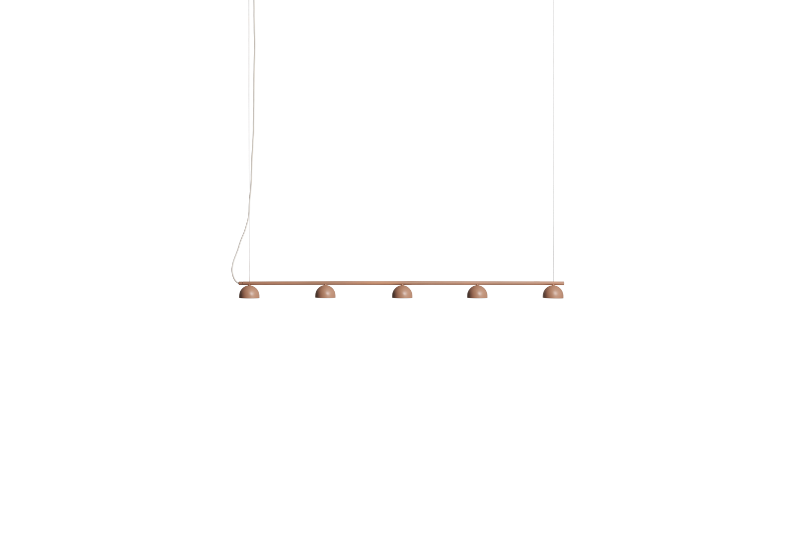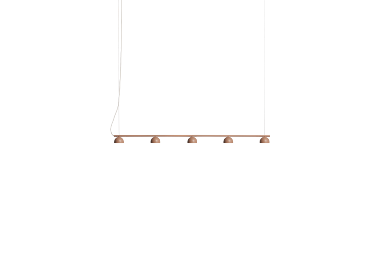 Vyrobená z práškově lakované ocelové trubice a dostupná ve vybraných barvách, závěsná lampa Blush Rail je integrována se sadou tří nebo pěti malých opálových akrylových difuzorů, které jsou všechny propojeny pro snadnou instalaci.
