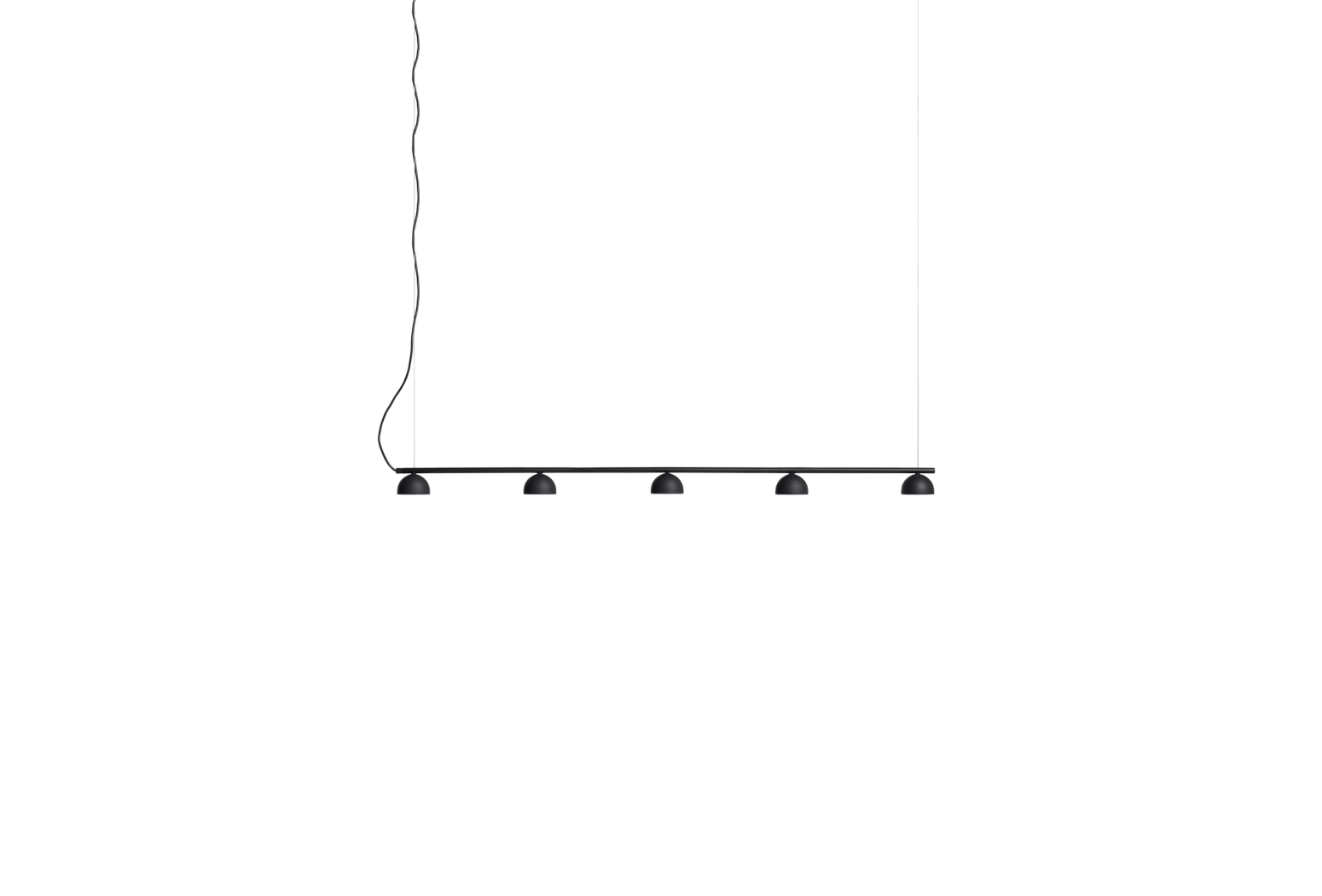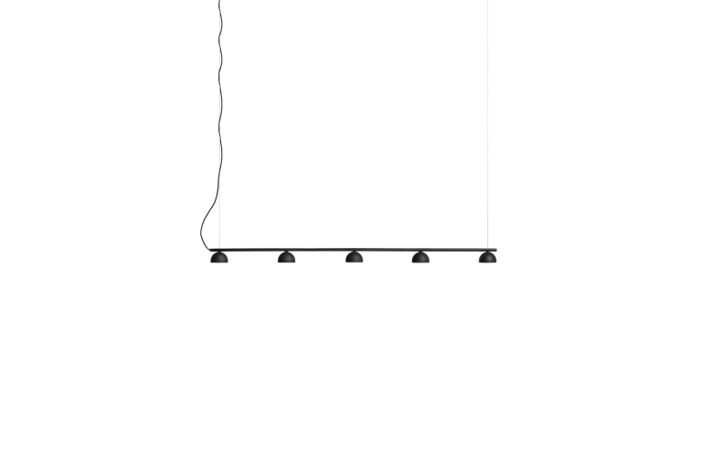 Vyrobená z práškově lakované ocelové trubice a dostupná ve vybraných barvách, závěsná lampa Blush Rail je integrována se sadou tří nebo pěti malých opálových akrylových difuzorů, které jsou všechny propojeny pro snadnou instalaci.