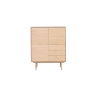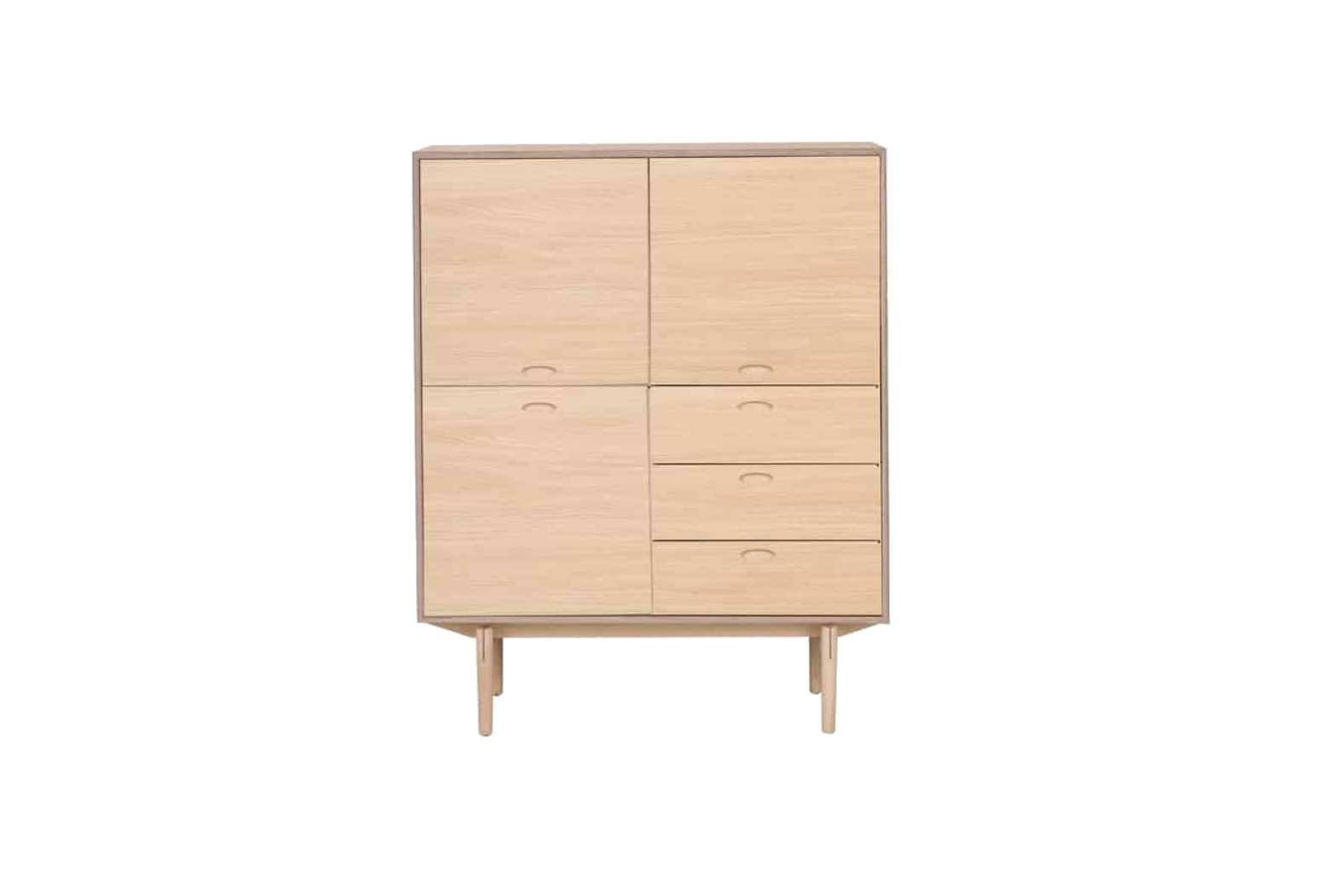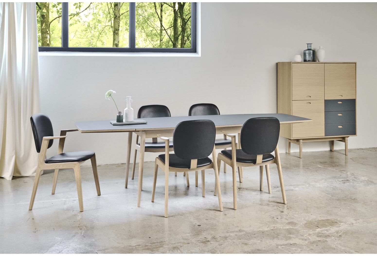 The Navis range of sideboards and highboards consist of veneered cabinets with mitre joints, rounded solid front edges and rounded solid legs matching the underframe of the tables. The doors have soft-closing hinges and the drawers have full extension and self-closing mechanism. Inside there are dividers and shelves and the back of the cabinets are fully veneered and can thereby be free standing. The Multi Purpose Highboard is prepared for wiring and comes with dark warm grey Fenix No. 222 on the work top surface. The glass display cabinet comes with 2 glass shelves and 2 wooden shelves and an LED light system with on/off sensor and dimmer. All cabinets comes with adjustable feet.