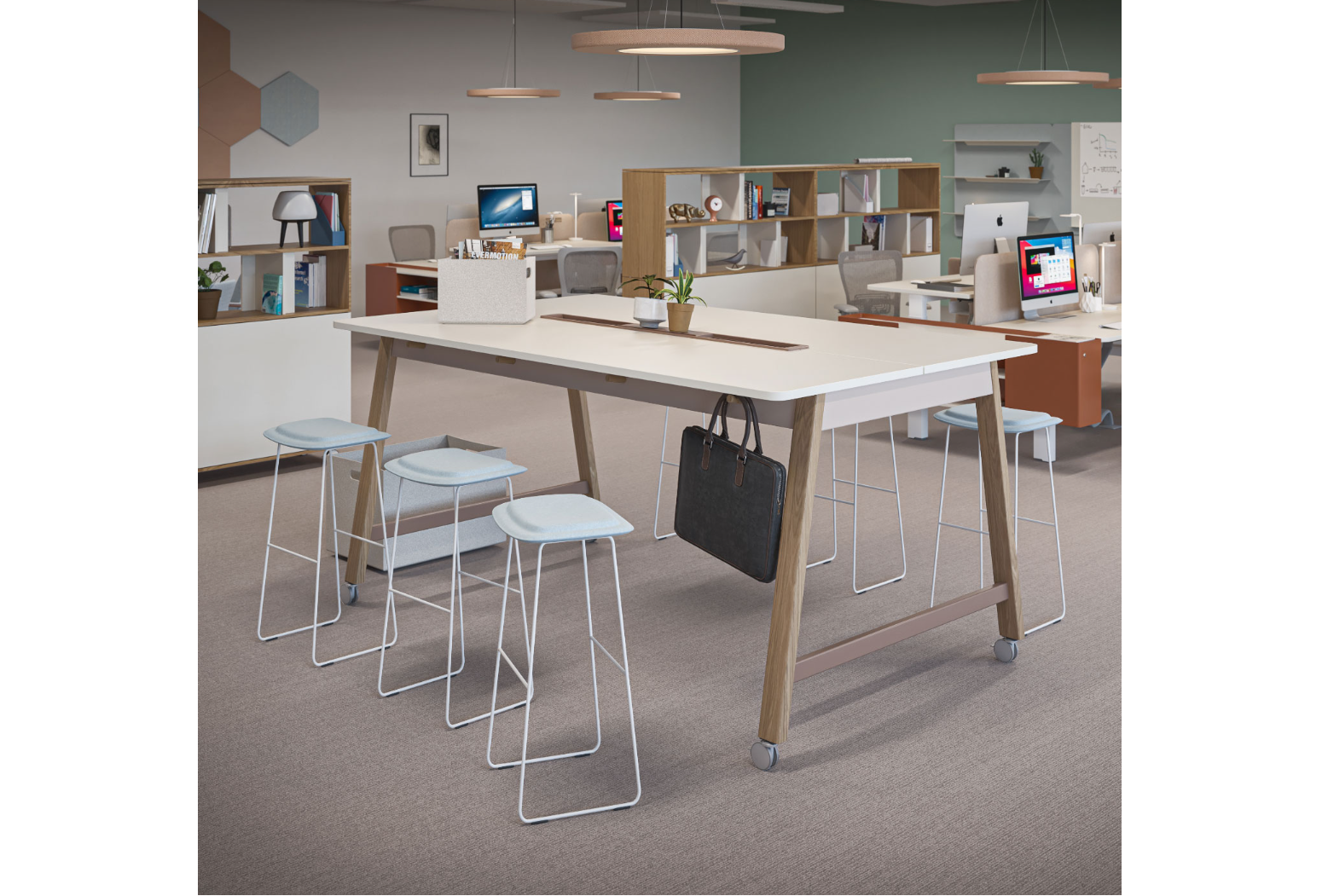 Meanwhile, distinctive leg and table options with variety of colour options provide unique flavours, and Intuity Park Bench standing height on wheels can be easily moved or re-oriented to create new office configurations or support distancing requirements.