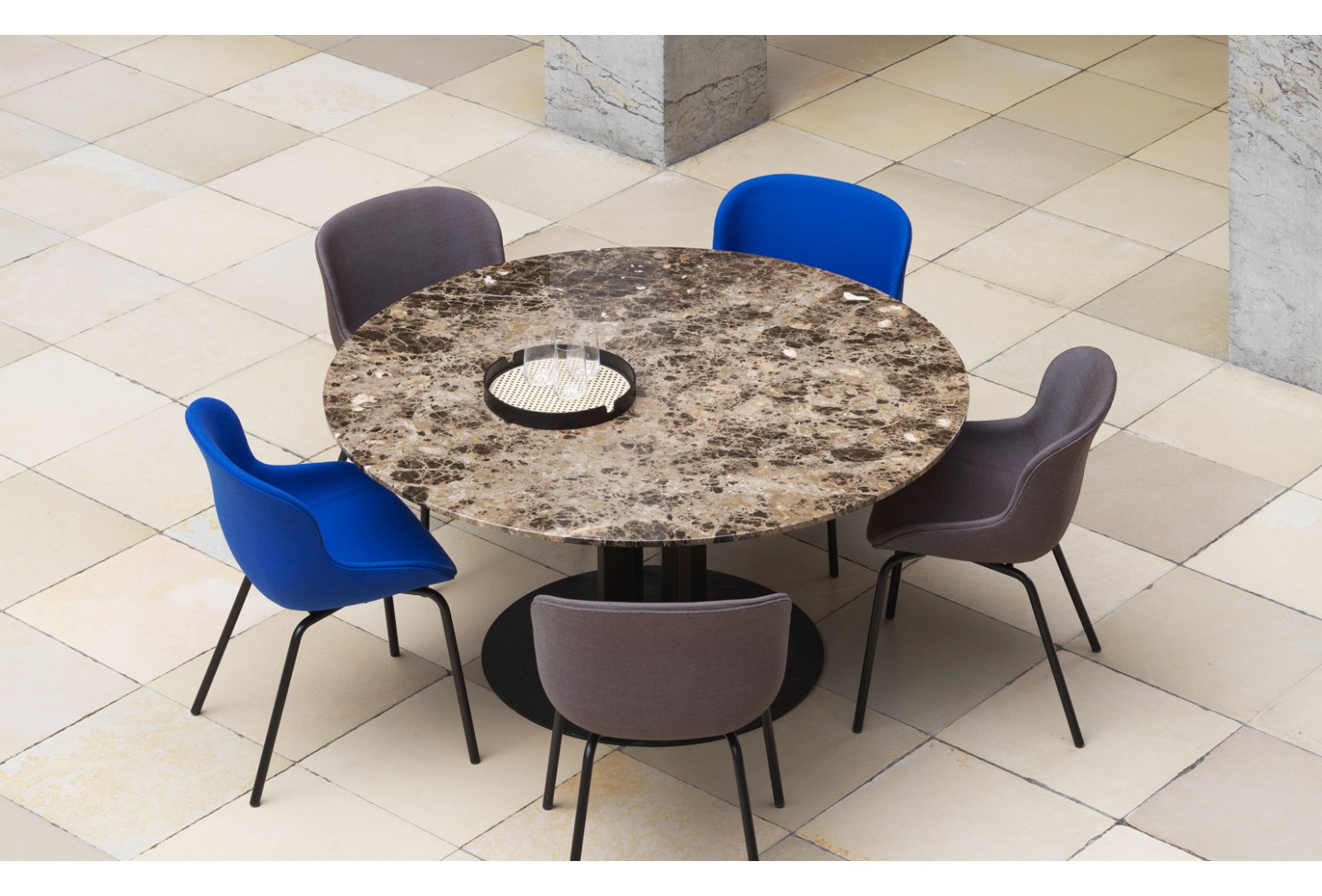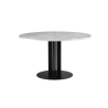 Read moreScala’s characteristic frame is composed of four columns that change in expression depending on the vantage point. The sturdy base is fashioned from solid steel while the round tabletop is available in either oak veneer, marble or stainless steel. Scala comes in coffee, café and dining table sizes, and the material’s structure is particularly enhanced, when the table is scaled up to 130 and 150 cm diameter sizes. With its inclusive circular shape, Scala gives equal status to everyone, whether the table is the focal point of the home dinner party, restaurant outing or conference meeting.