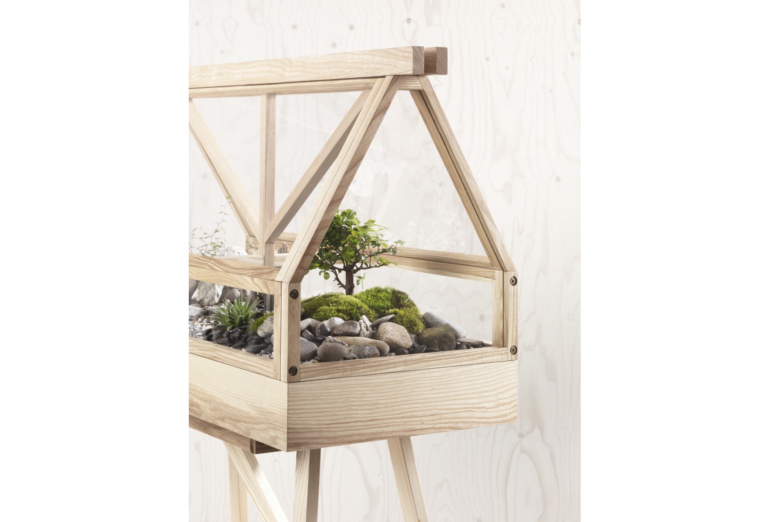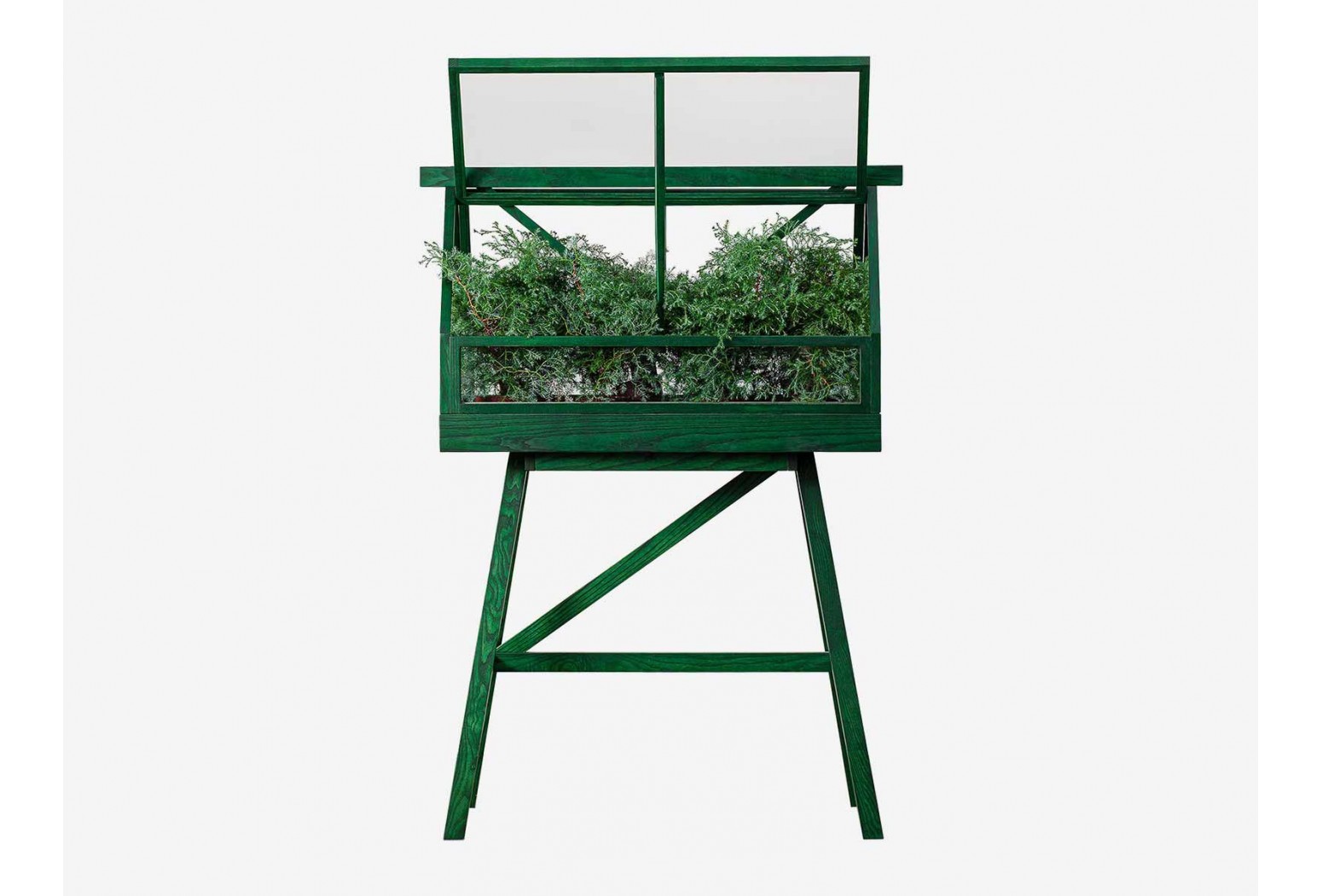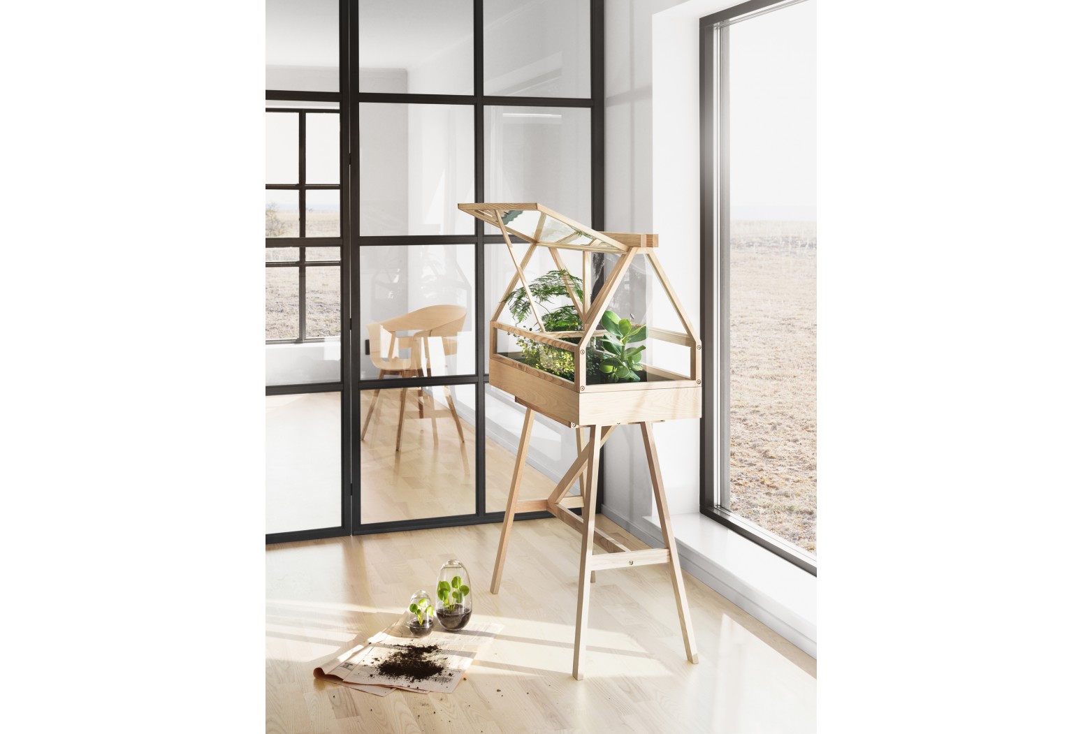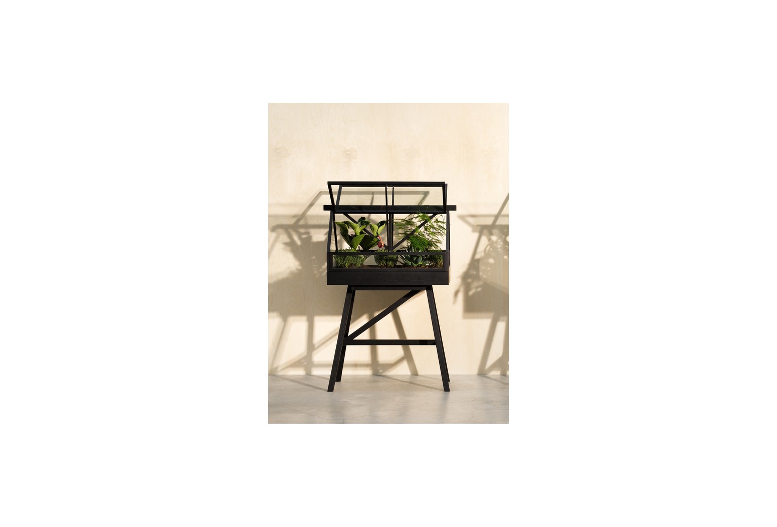 The Atelier 2 Greenhouse is made from lacquered solid ash timber with panes of toughened glass and a planting tray made of galvanized metal. The wooden support reinforces the architectonic expression and converts it into a freestanding ornament in the room. The hatches can be secured in the raised position while one is working with the plants.