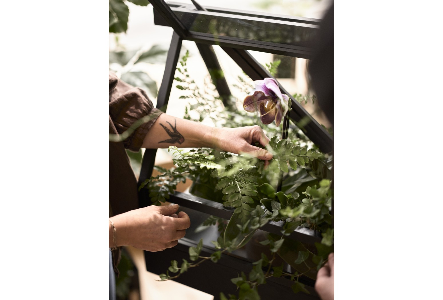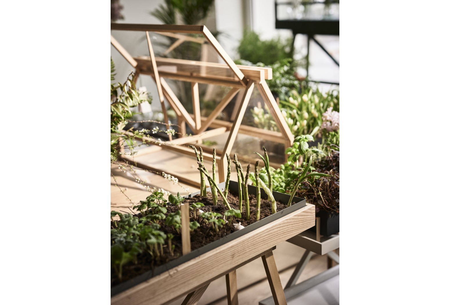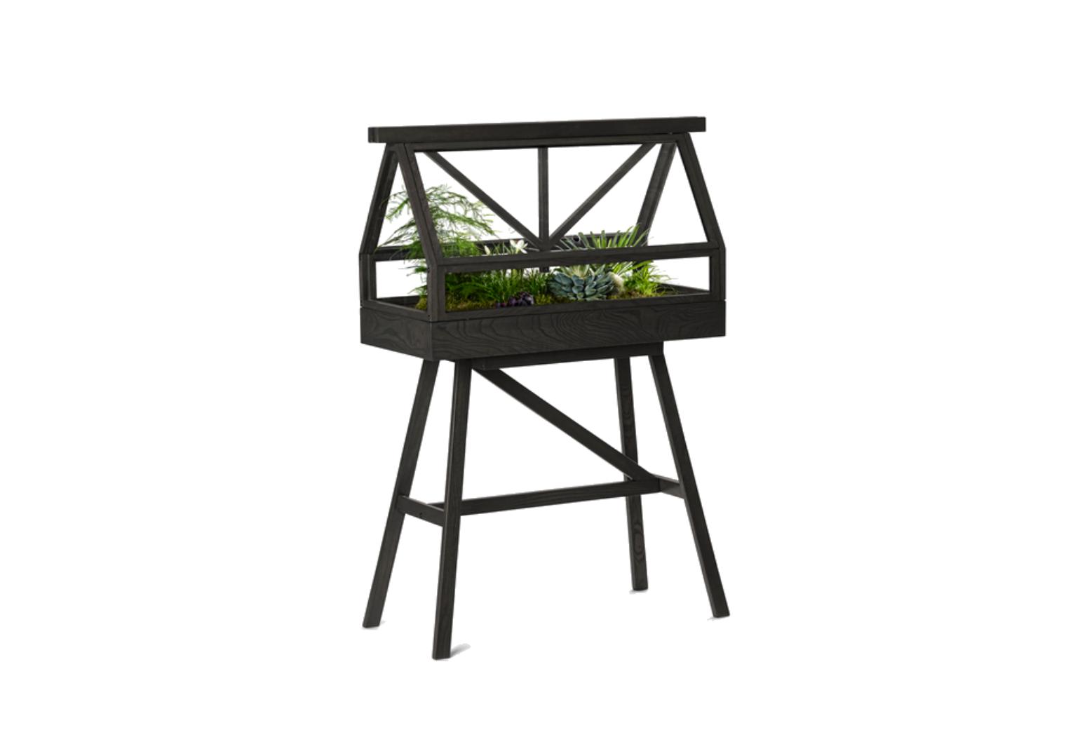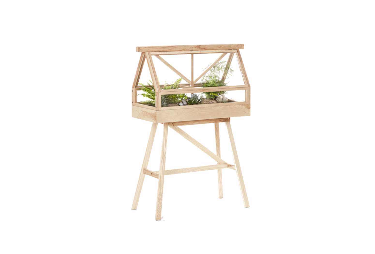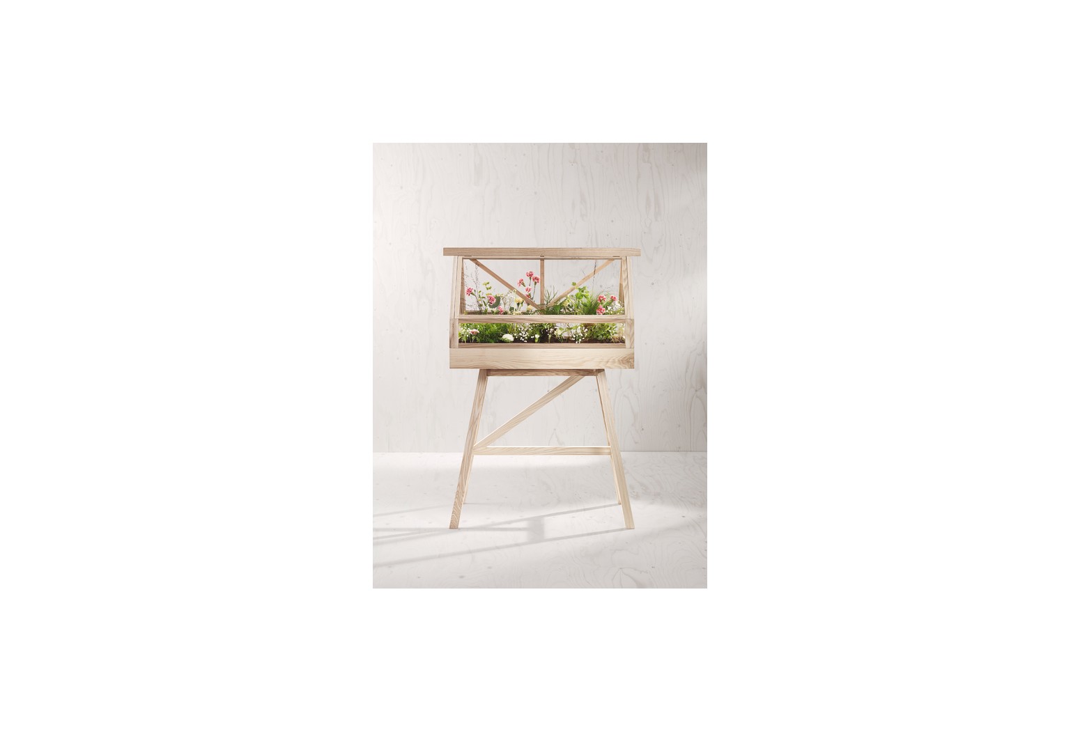 The Atelier 2 Greenhouse is made from lacquered solid ash timber with panes of toughened glass and a planting tray made of galvanized metal. The wooden support reinforces the architectonic expression and converts it into a freestanding ornament in the room. The hatches can be secured in the raised position while one is working with the plants.