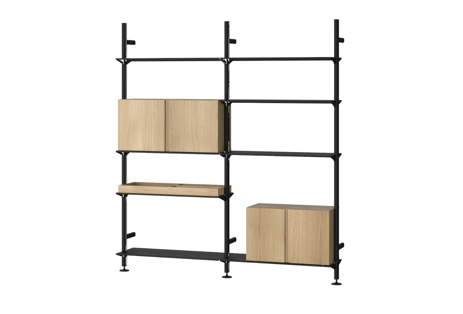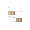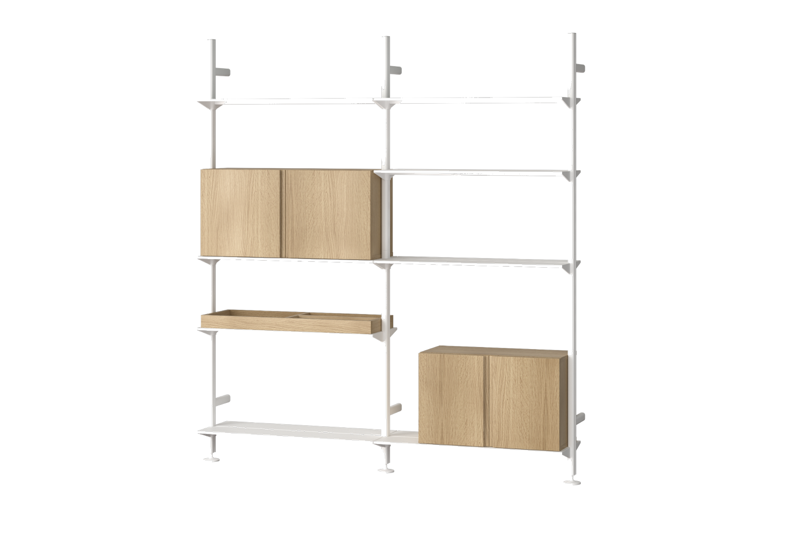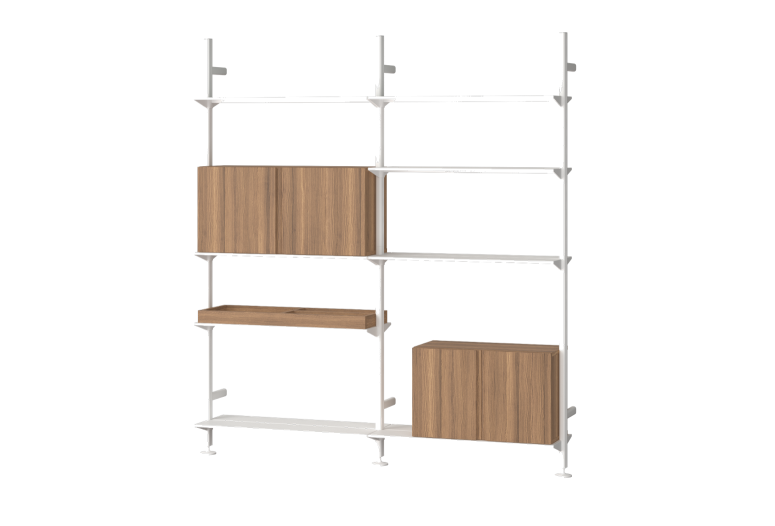 The set includes 3 pcs of metal posts 265 cm, 8 pcs of shelves 90 cm, 1 pc of cabinet 70 cm, 1 pc of cabinet 90 cm, Wall mounting set.
