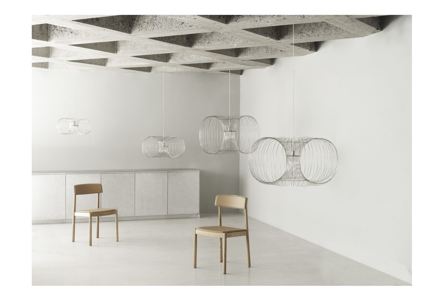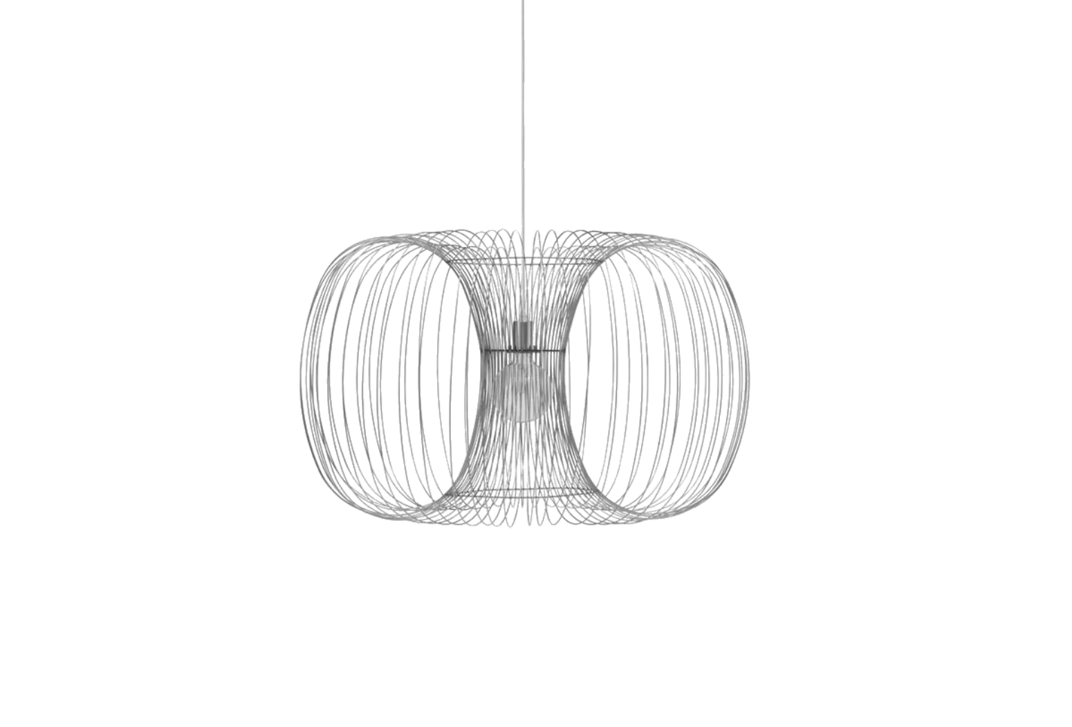 Coil is a pendant lamp collection characterized by its rounded rectangle shape created by curved stainless-steel wires. The pendant is very simple in its design but will become an aesthetic focal point in any setting. The collection is available in four different sizes, making it adaptable to both smaller residences and big, spacious environments.