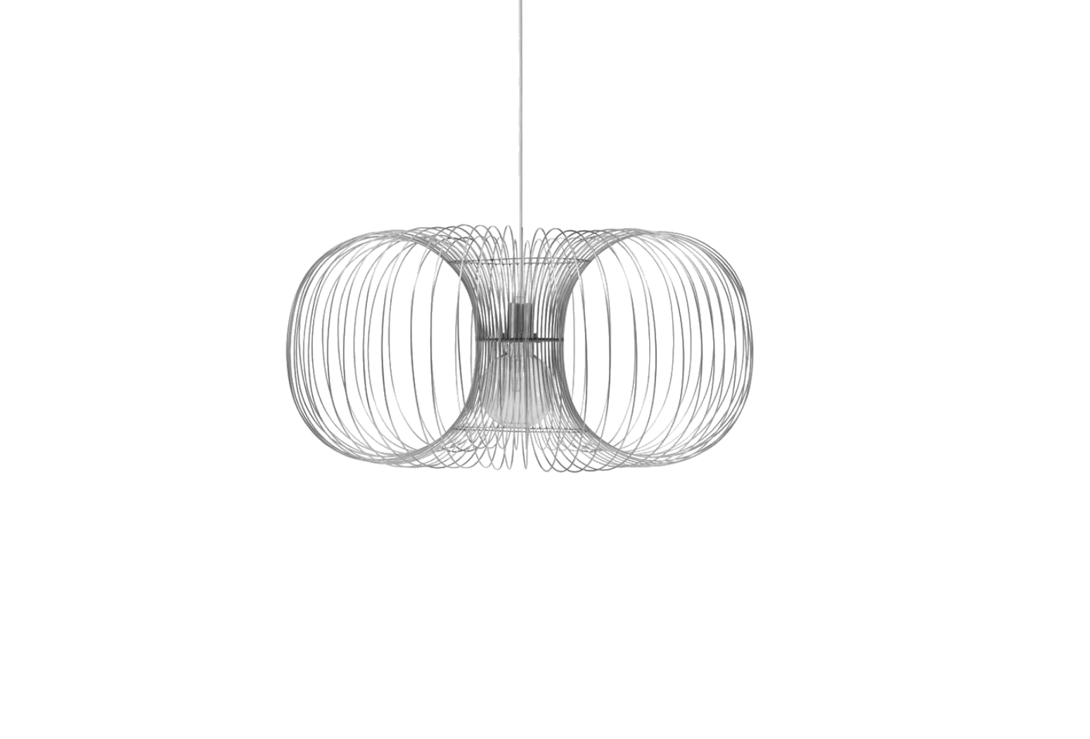Coil is a pendant lamp collection characterized by its rounded rectangle shape created by curved stainless-steel wires. The pendant is very simple in its design but will become an aesthetic focal point in any setting. The collection is available in four different sizes, making it adaptable to both smaller residences and big, spacious environments.
