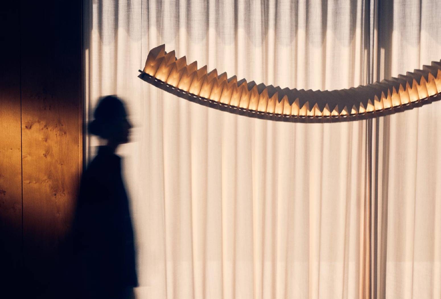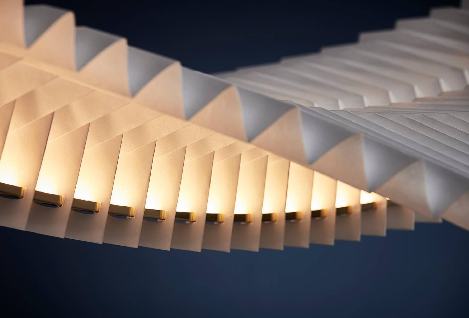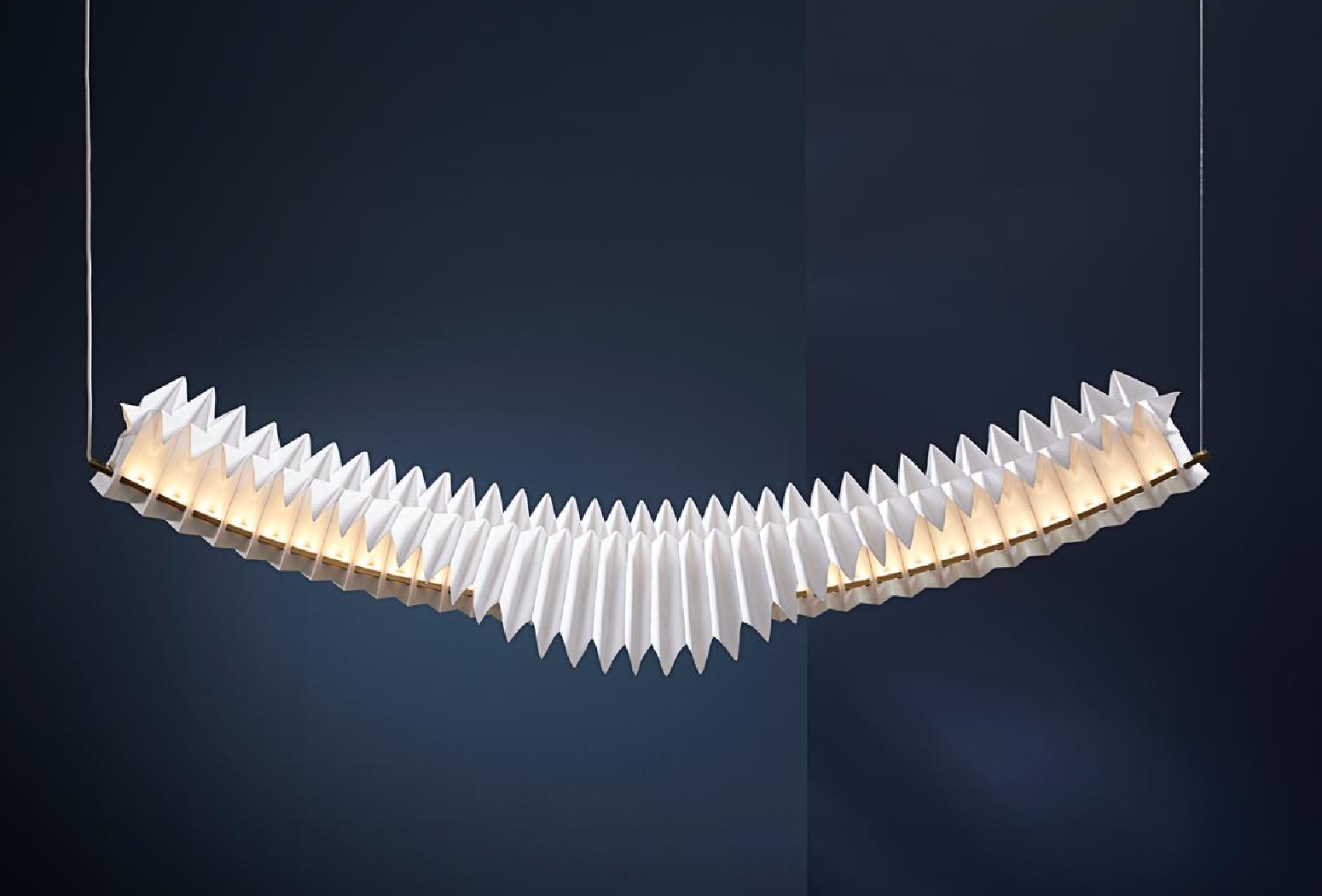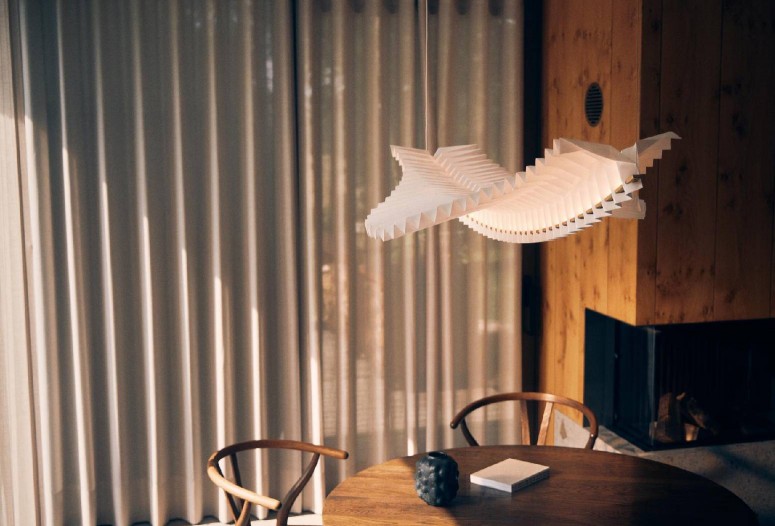 When contrasted with Sora’s delicate, paper-like construction, the diffused effect of the linear LED light embedded within the luminaire’s construction creates an ethereal glow with an intangible quality. Designed by visionary design practitioners, Fung + Bedford, a UK-based duo working exclusively with the art of origami folding techniques, Sora is a formal continuation of the duo’s creative practice, which succeeds in seamlessly blending architecture and design.