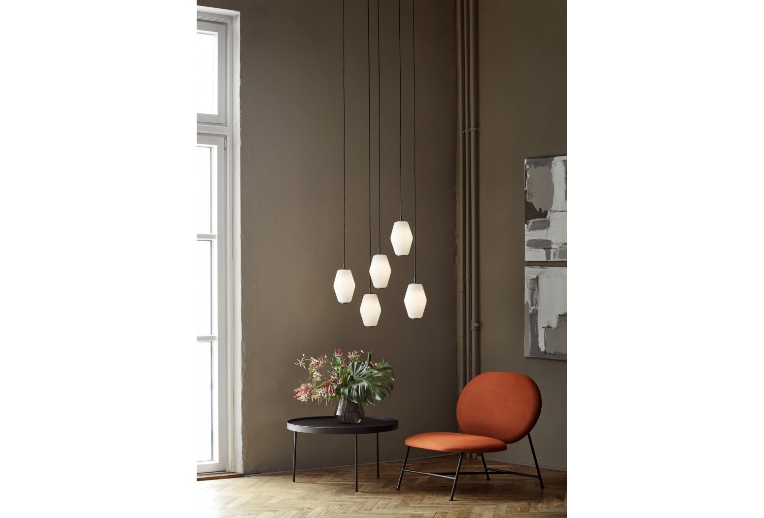 Read moreStín je vyroben z úst foukaného skla a leptěn povrchovou úpravou, která vytváří hladký matný povrch. Kovové části Dahlu jsou tmavě šedé nebo vyrobené z matné mosazi. Stínidla se připevňuje na kovový disk nahoře a vytváří místo pro dvojici soustředných kroužků, které se zasunou do otvoru dole. Přívěsek má stejné nenápadné rysy, které charakterizují Dokka a Birdy – dva další klasické designy Birgera Dahla, které Northern také znovu představil.