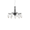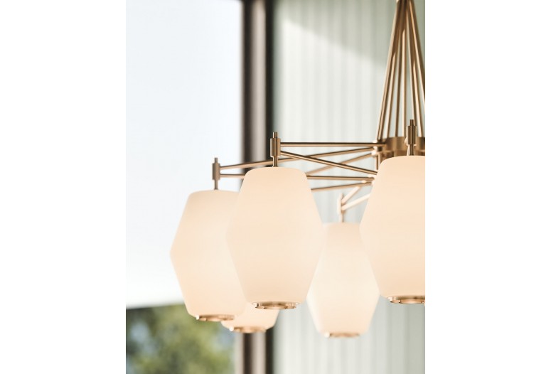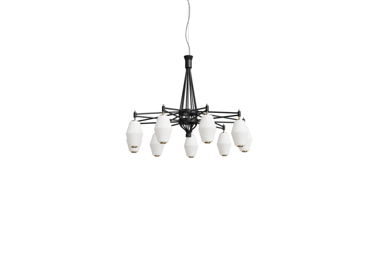 Available with either small or large glass shades, in brass finish or black with brass details, the chandelier anchors any room with timeless elegance and architecturalbalance.