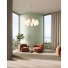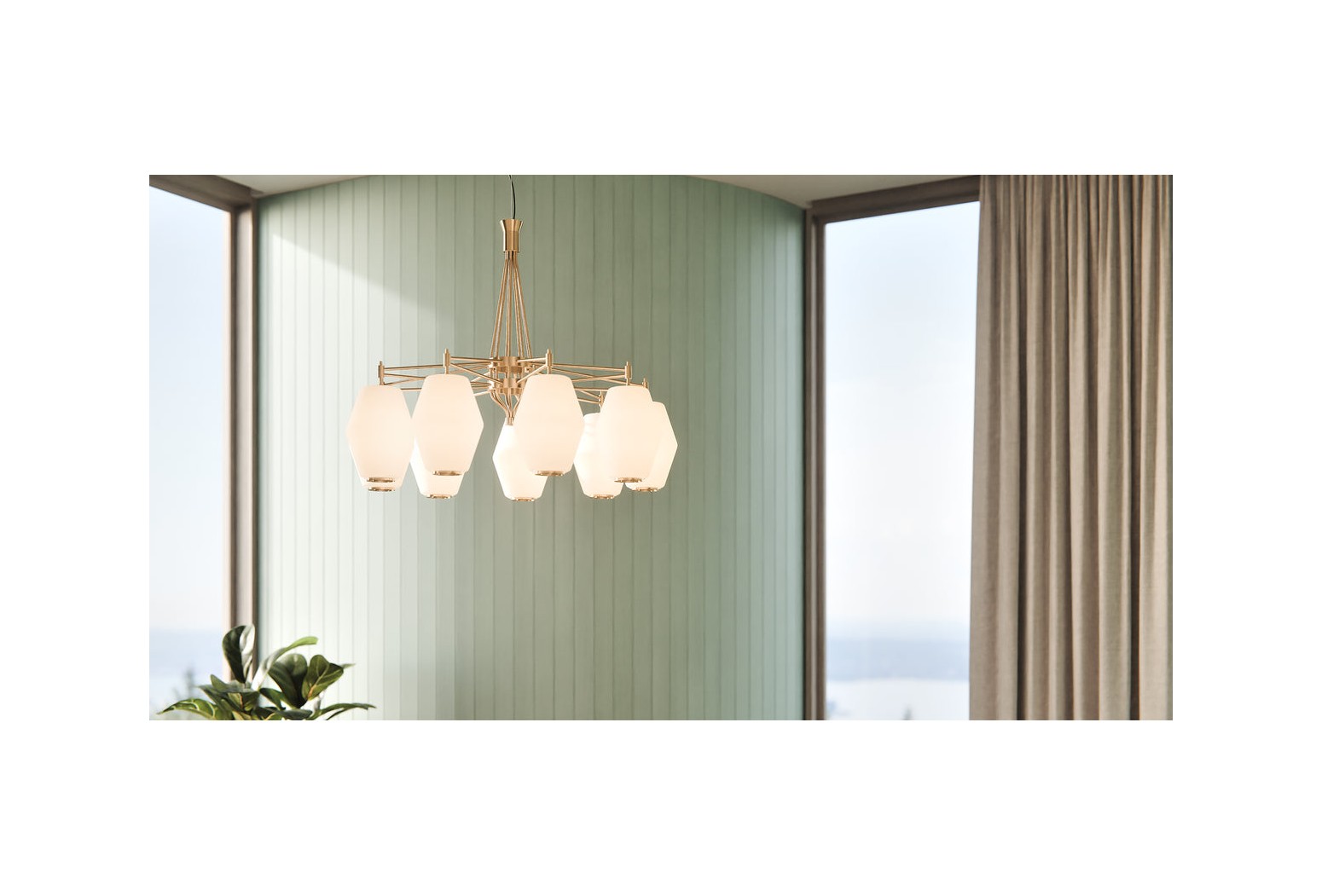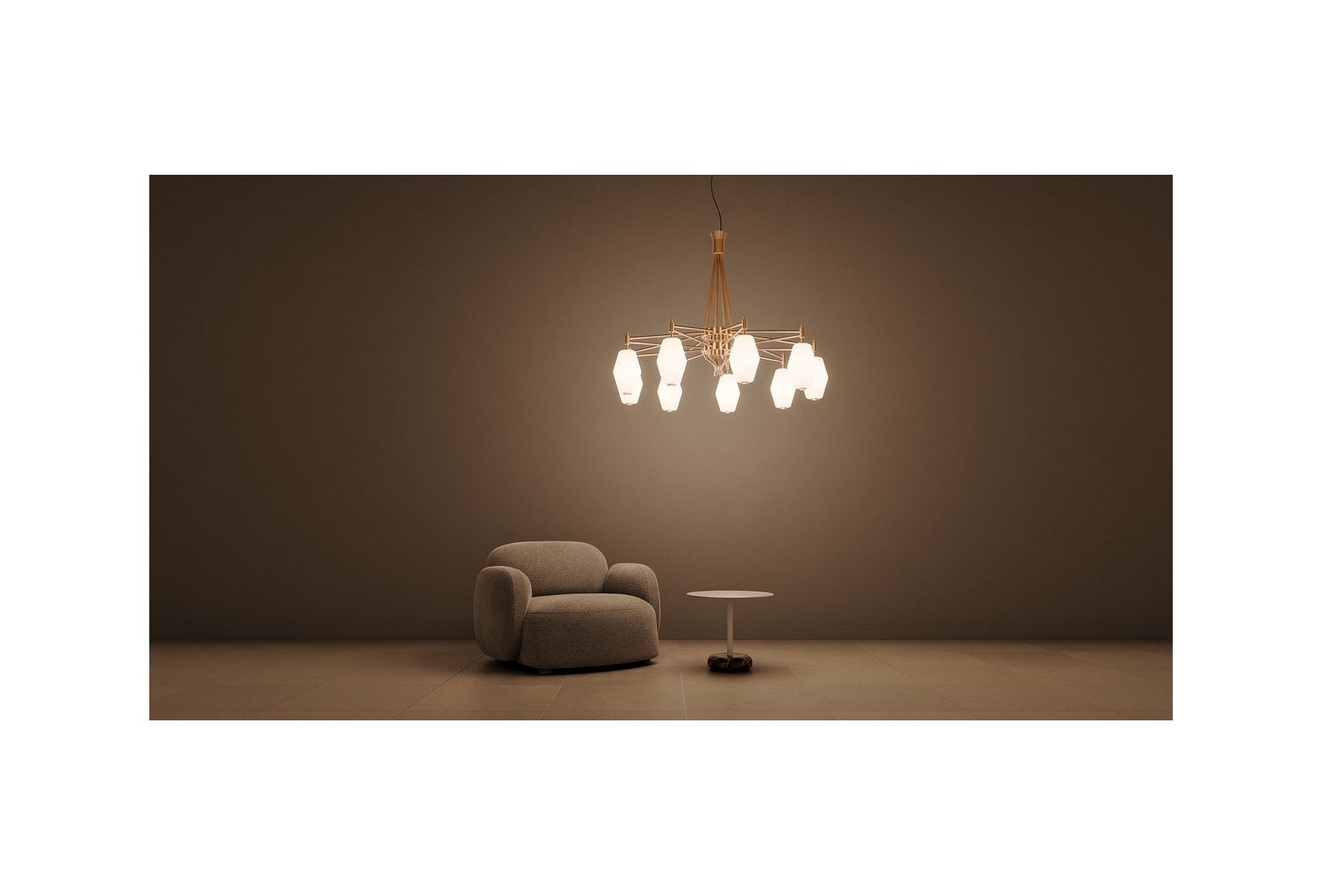 The reissued chandelier stays true to Dahl’s mid-century vision while being adaptedfor contemporary living. Mouth-blown glass globes diffuse light softly across theroom, while brass details add a note of refinement. Proportions have been carefullyadjusted to suit modern ceiling heights, making the design as practical as it is iconic.