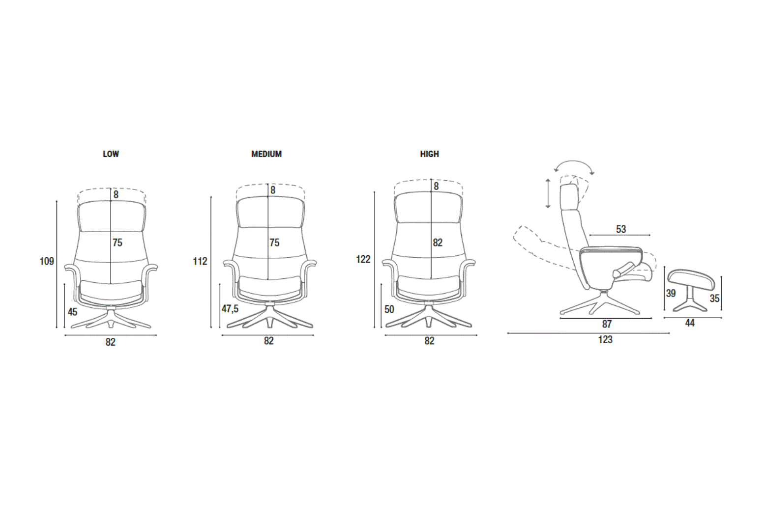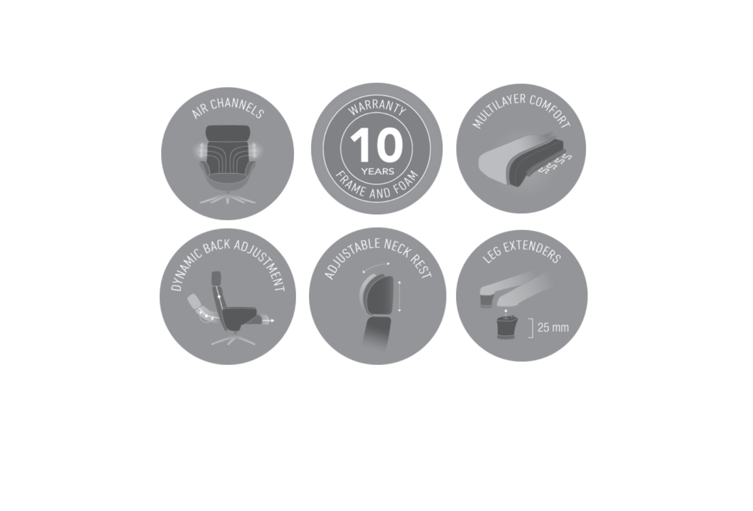 Aarhus is designed with a gravity based mechanism which lets you change positions smoothly and effortlessly. The footrest will ensure you a calm place to relax and unwind. The extra soft headrest is adjustable in height and angle.