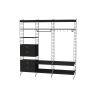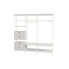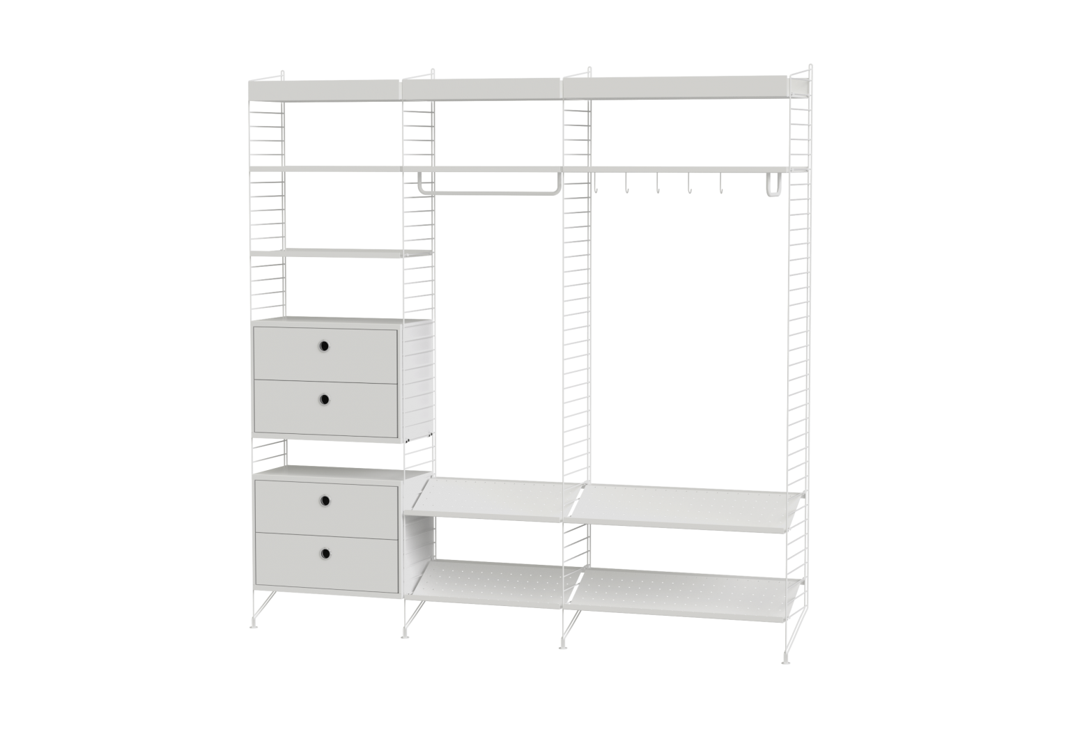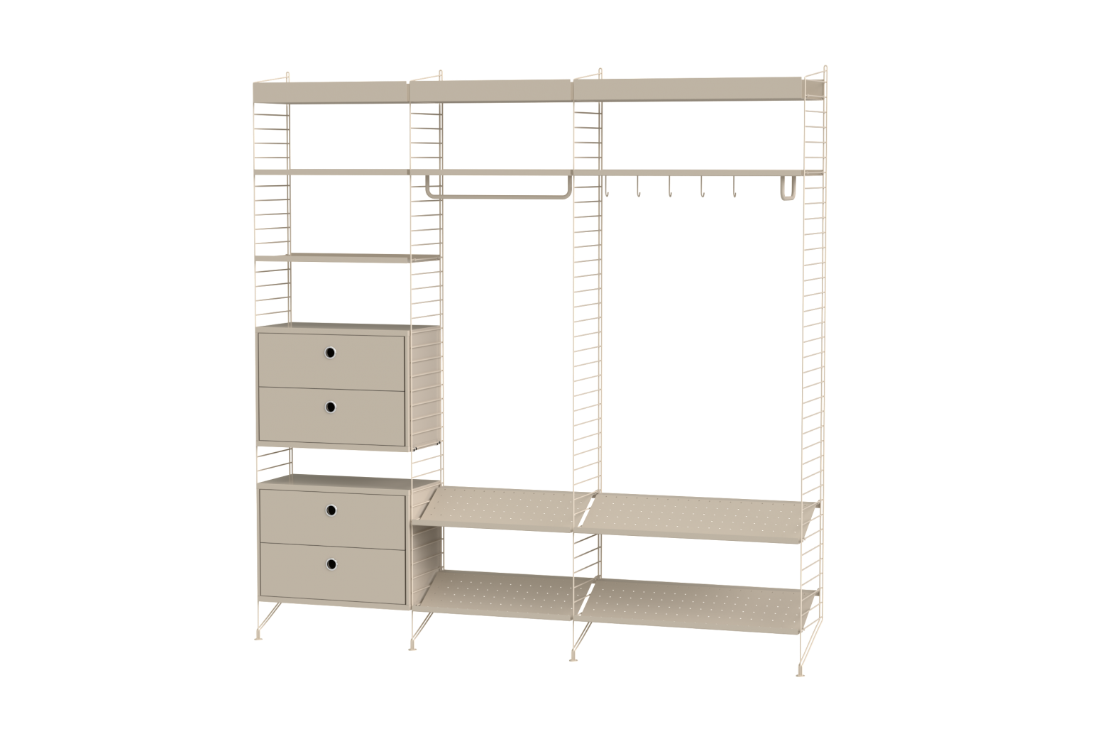 The set contains: 4 pcs side panel 200 * 30 cm, 2 pcs shelves 58 * 30 cm, 2 pcs tin shelves 58 * 30 * 7 cm, 1 pc tin shelves 78 * 30 * 7 cm, 1 pc tin shelves 78 * 30 cm , with hooks, 1 piece of metal shelves 58 * 30 cm with clothes rail, 2 pieces of cabinets with drawers 58 * 42 * 30 cm, 2 pieces of metal shelves for shoes 58 * 30 cm, 2 pieces of metal shelves for shoes 78 * 30 cm.