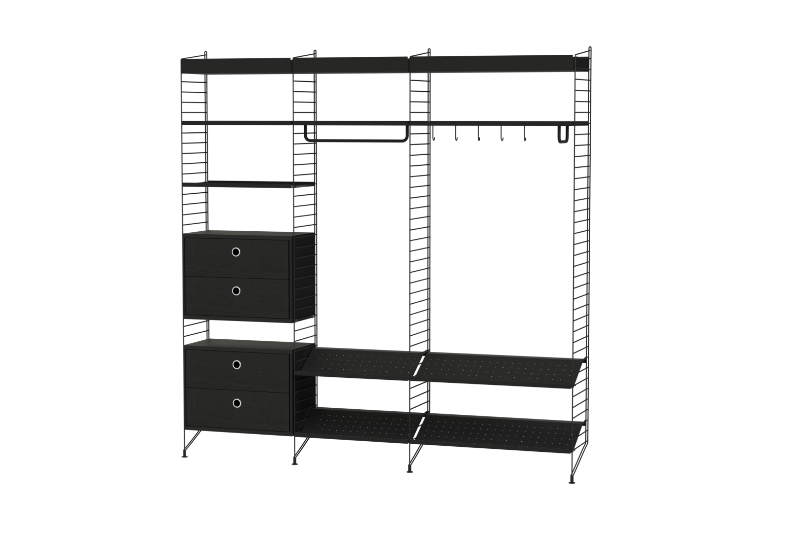 Prepared assembly from the String system. Complete set of elements according to the display and list. From the menu it is possible to choose the material design of wooden parts and the shade of painting metal struts.