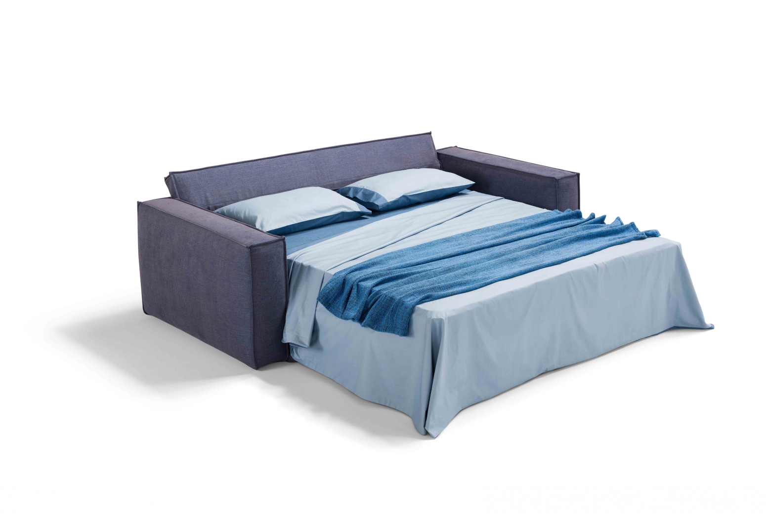 Mechanism: convertible sofa bed with standard electro-welded mesh. The rear backrest can be adjusted in two inclinations offering two different seat depths. Padding: standard stretch polyurethane D.30 h 13 cm mattress. Seat: 35 kg/m3 density. Upper portion: 50 Kg/m3 memory foam.Backrest: goose down. Feet: black plastic. Optional: available in the version without bed. Possibility to request the model with slats and wheeled mechanism. Optional mattresses available. Upholstery: completely removable fabric. Two complimentary Model D24 cushions in the same colour and category as the sofa.