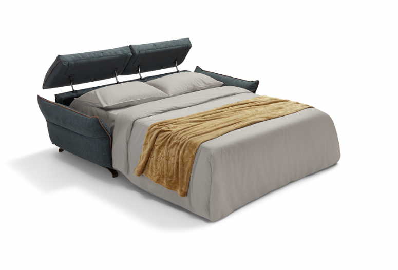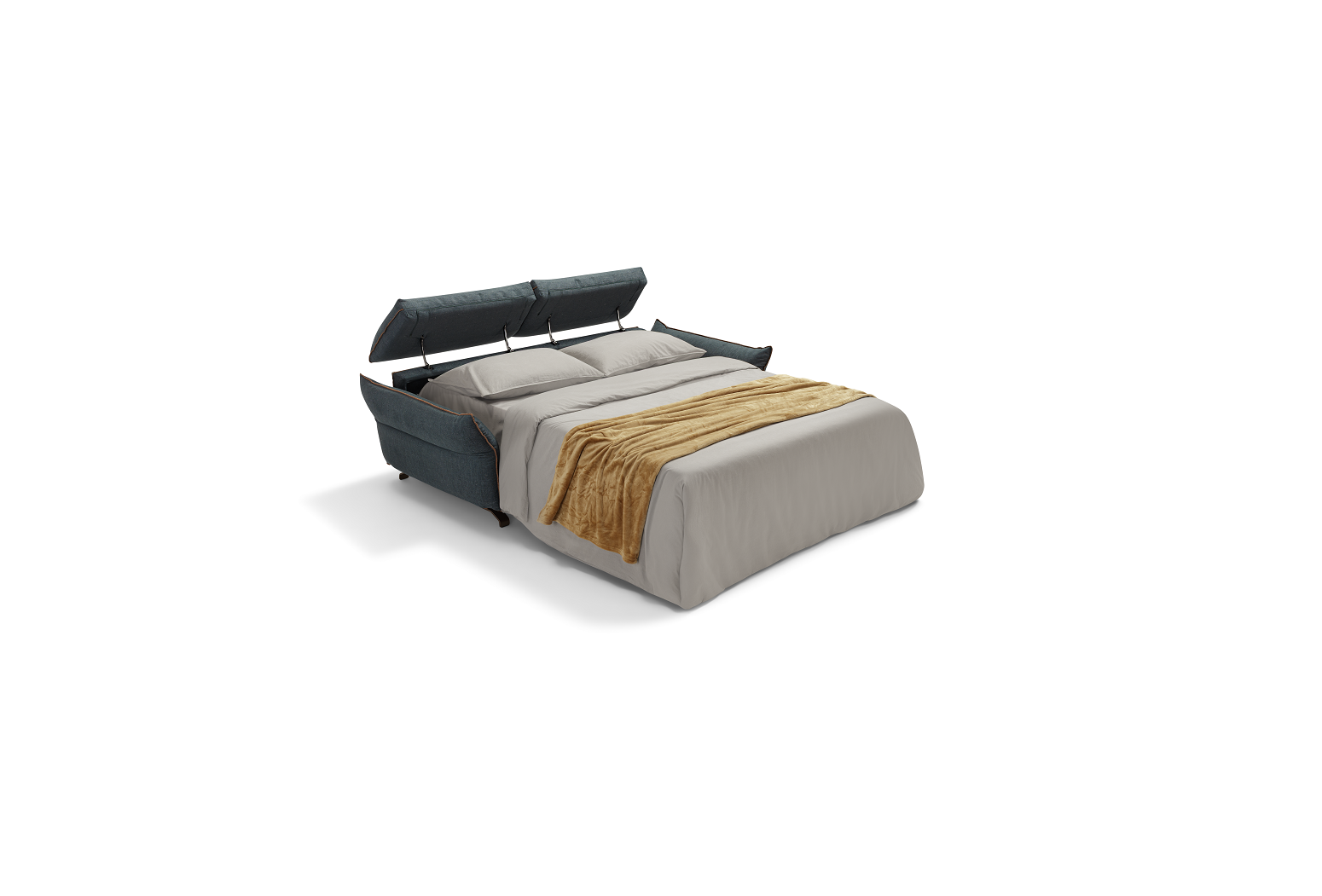 Convertible Sofa Bed with adjustable armrests and backrest, offering various configurations in terms of shape and size. Mechanism: standard electro-welded mesh. Structure: wood agglomerate, plywood and fir battens. Standard mattress: polyurethane stretch HR35 h 13 cm. Seat: polyurethane density 35 kg/m³. Backrest: polyurethane density 25 kg/m³. Feet: h 13 cm, available in different metal finishes. Option: wood slats mechanism. Upholstery: 100% removable fabric. Two complimentary cushions model D24 in the same colour and category as the sofa. Available in the version without bed.
