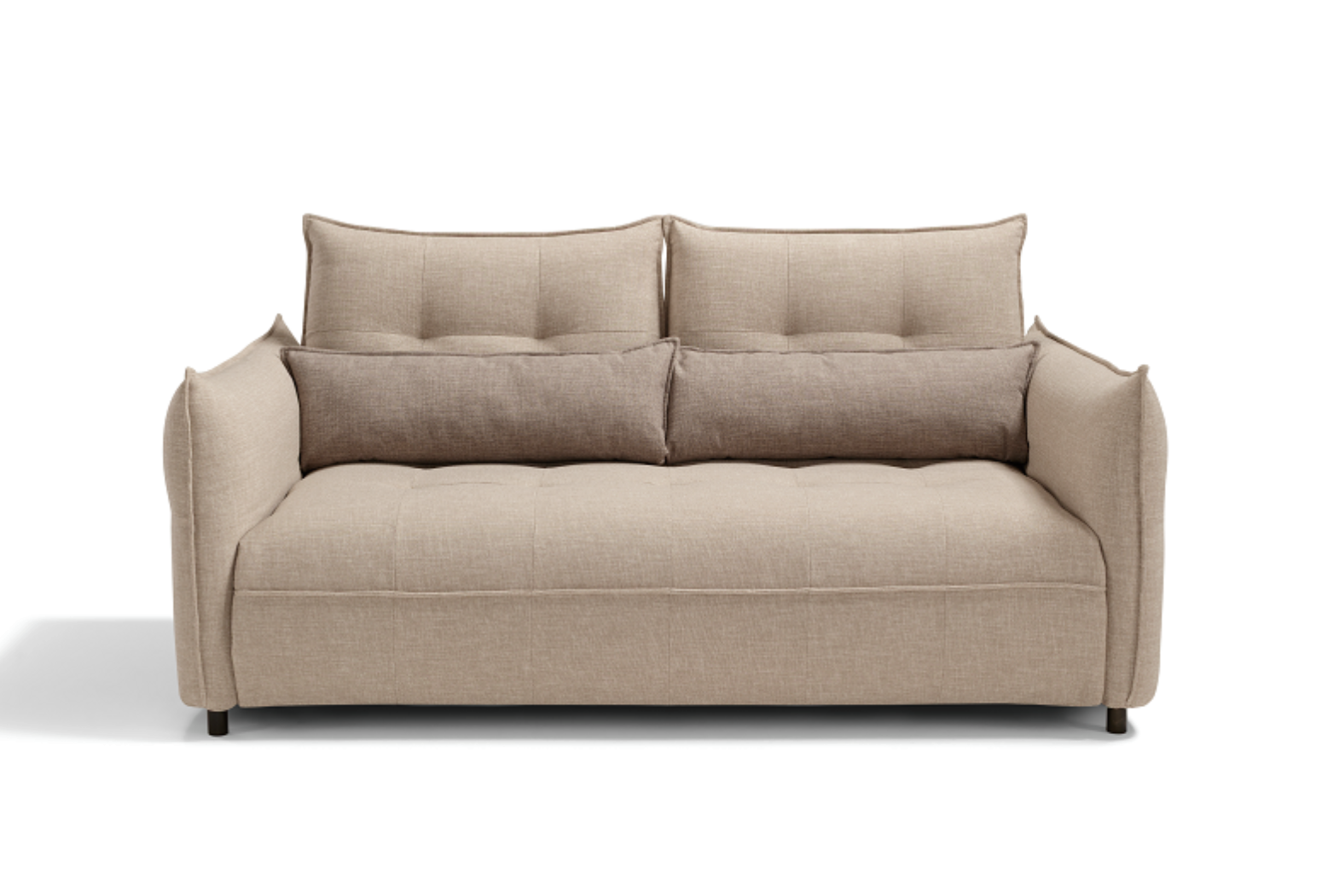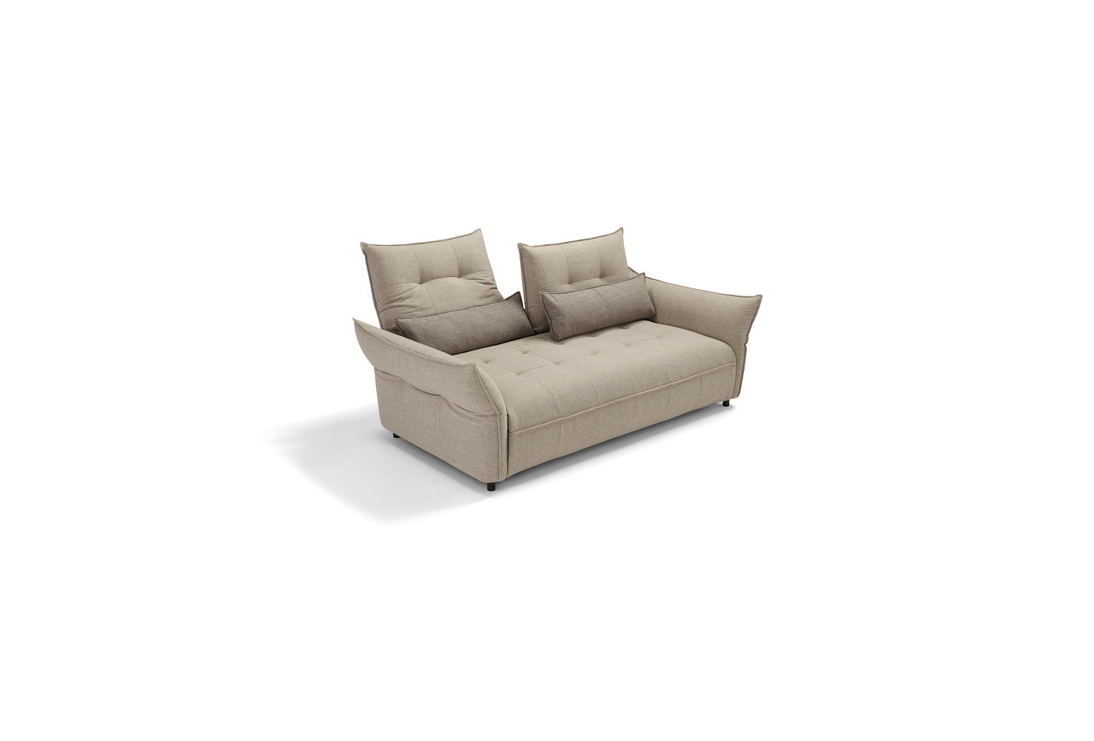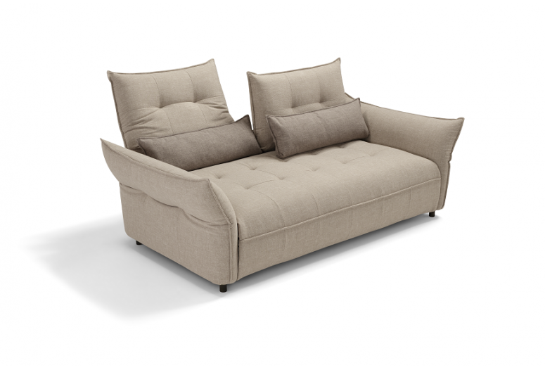 Convertible Sofa Bed with adjustable armrests and backrest, offering various configurations in terms of shape and size. Mechanism: standard electro-welded mesh. Structure: wood agglomerate, plywood and fir battens. Standard mattress: polyurethane stretch HR35 h 13 cm. Seat: polyurethane density 35 kg/m³. Backrest: polyurethane density 25 kg/m³. Feet: h 13 cm, available in different metal finishes. Option: wood slats mechanism. Upholstery: 100% removable fabric. Two complimentary cushions model D24 in the same colour and category as the sofa. Available in the version without bed.