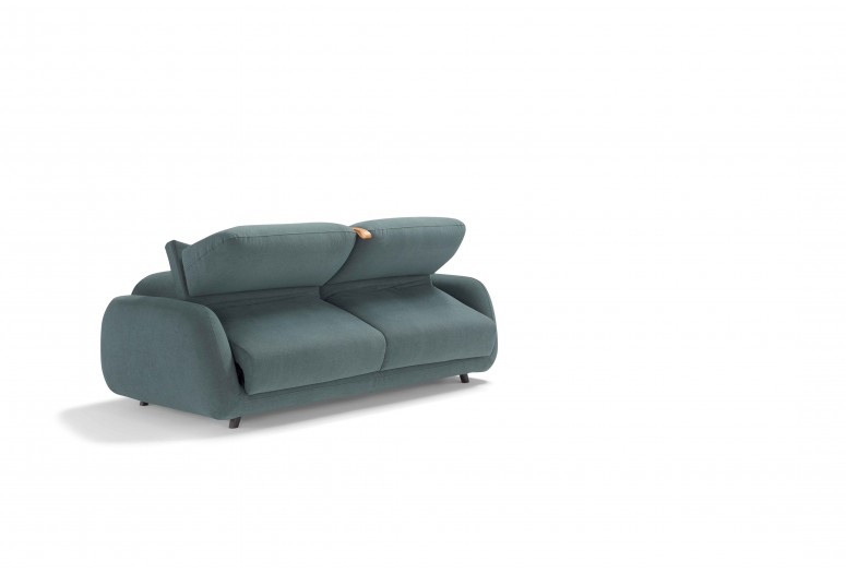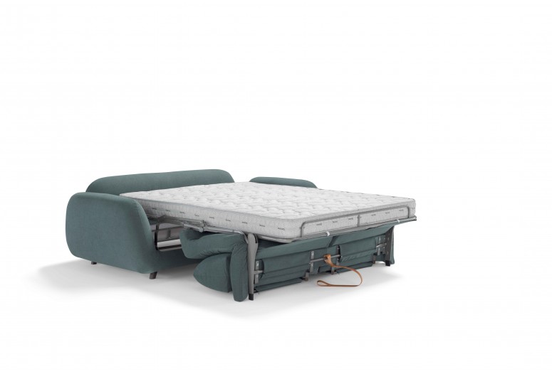 Convertible sofa bed. Mechanism: standard electro-welded mesh. Structure: wood agglomerate, plywood and fir battens. Standard mattress: polyurethane stretch HR35 h 13 cm. Seat: polyurethane density 35 kg/m3. Backrest: polyurethane density 24 kg/m3. Feet: h 8 cm in wood available in various finishes. Option: wooden slats mechanism. Upholstery: 100% removable fabric. Two  omplimentary lumbar cushions in the same colour and category as the sofa. Available in the version without bed.