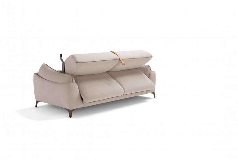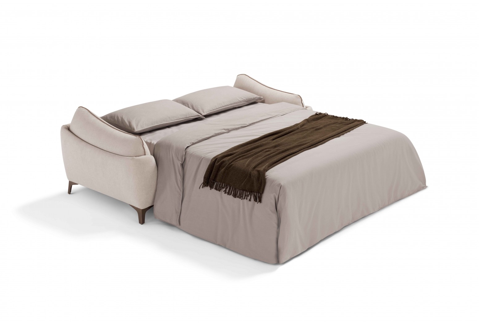 Convertible sofa bed. Mechanism: standard electro-welded mesh. Structure: wood agglomerate, plywood and fir battens. Standard mattress: polyurethane stretch HR35 h 13 cm. Seat: polyurethane density 35 kg/m3. Backrest: polyurethane density 24 kg/m3. Feet: H 13 cm, available in different metal finishes. Option: wooden slats mechanism and wheeled mechanism. Upholstery: 100% removable fabric. Partially removable leather. Two complimentary cushions model D24 in the same colour and category as the sofa. For leather sofas, free cushions D24 are not included. Available in the version without bed.