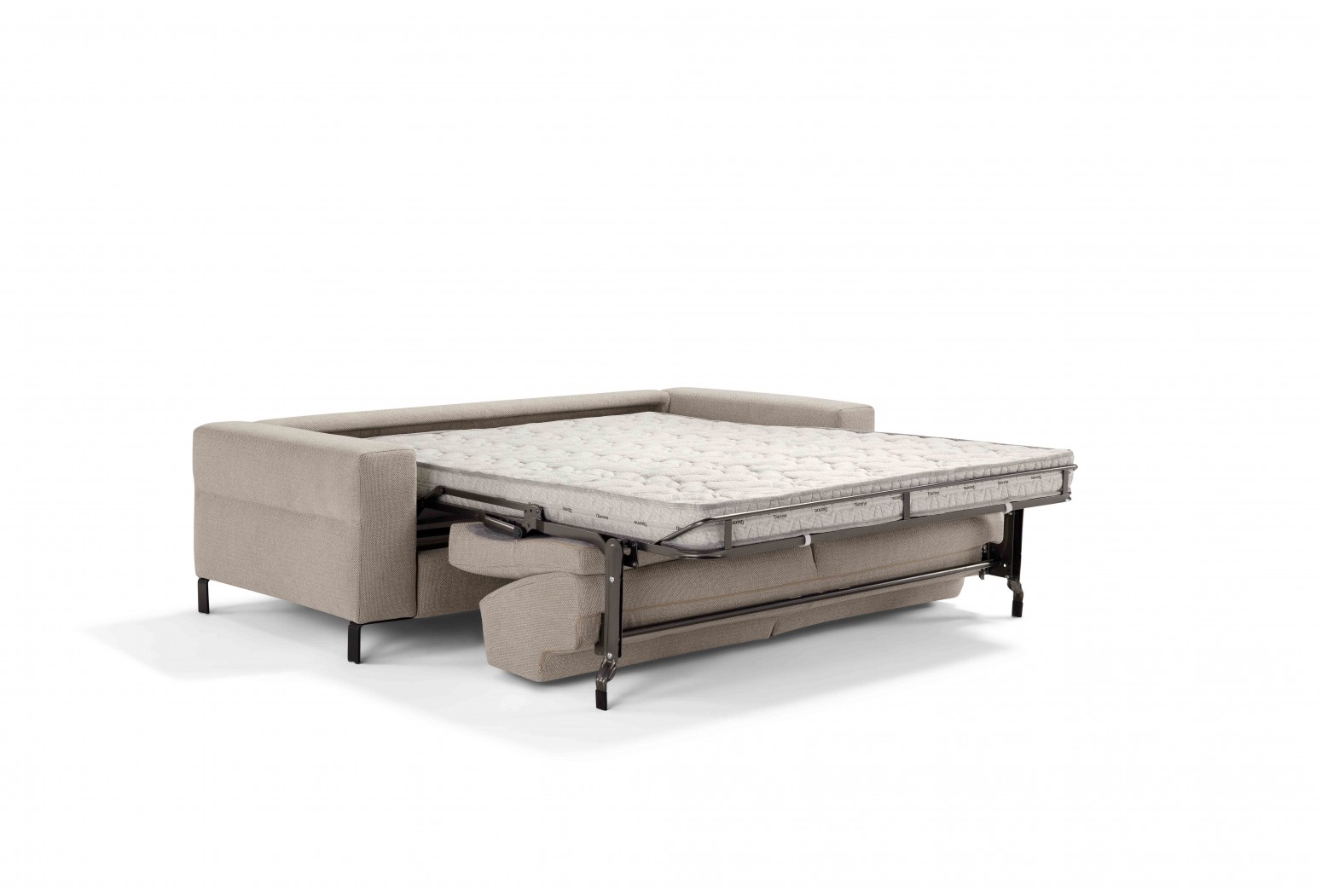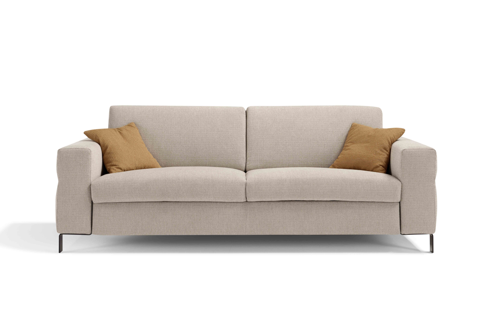 Mechanism: convertible sofa bed with standard electro-welded mesh, feet h 13 cm. Padding: standard stretch polyurethane HR35 h 13 cm mattress. Seat: 30 kg/m3 density. Backrest: 25 kg/m3 density. Feet: steel, in a variety of colours. Optional: available in the version without bed. Possibility to request the model with slats. Upholstery: completely removable fabric. Partially removable leather. Two complimentary Model D24 cushions in the same colour and category as the sofa. For leather sofas, free cushions D24 are not included.
