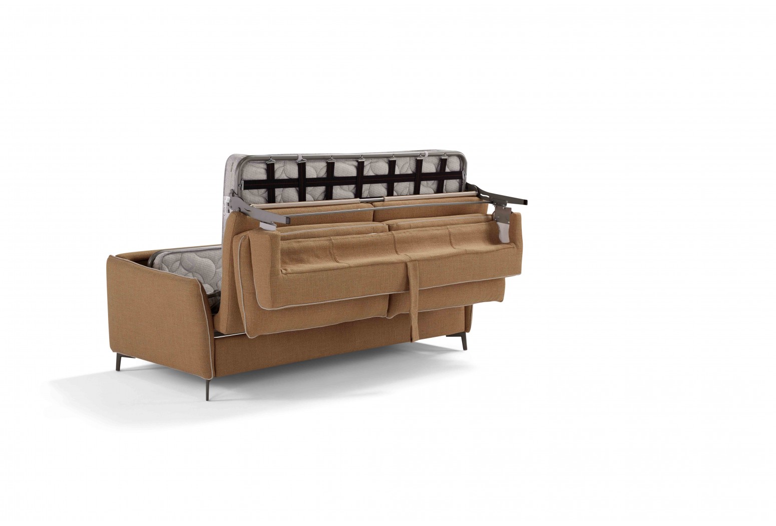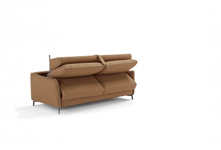Mechanism: convertible sofa bed with standard electro-welded mesh, feet h 13 cm. Padding: standard stretch polyurethane D.30 h 13 cm mattress. Seat: 30 kg/m3 density. Backrest: 21 kg/m3 density. Feet: iron with “Bronze” colour. Optional: available in the version without bed. Possibility to request the model with slats. Optional mattresses available *(Topper Memory and 2 Foam mattresses available only for the version with an electro-welded bed base). Upholstery: completely removable fabric. Partially removable leather. Two complimentary Model D24 cushions in the same colour and category as the sofa. For leather sofas, free cushions D24 are not included.