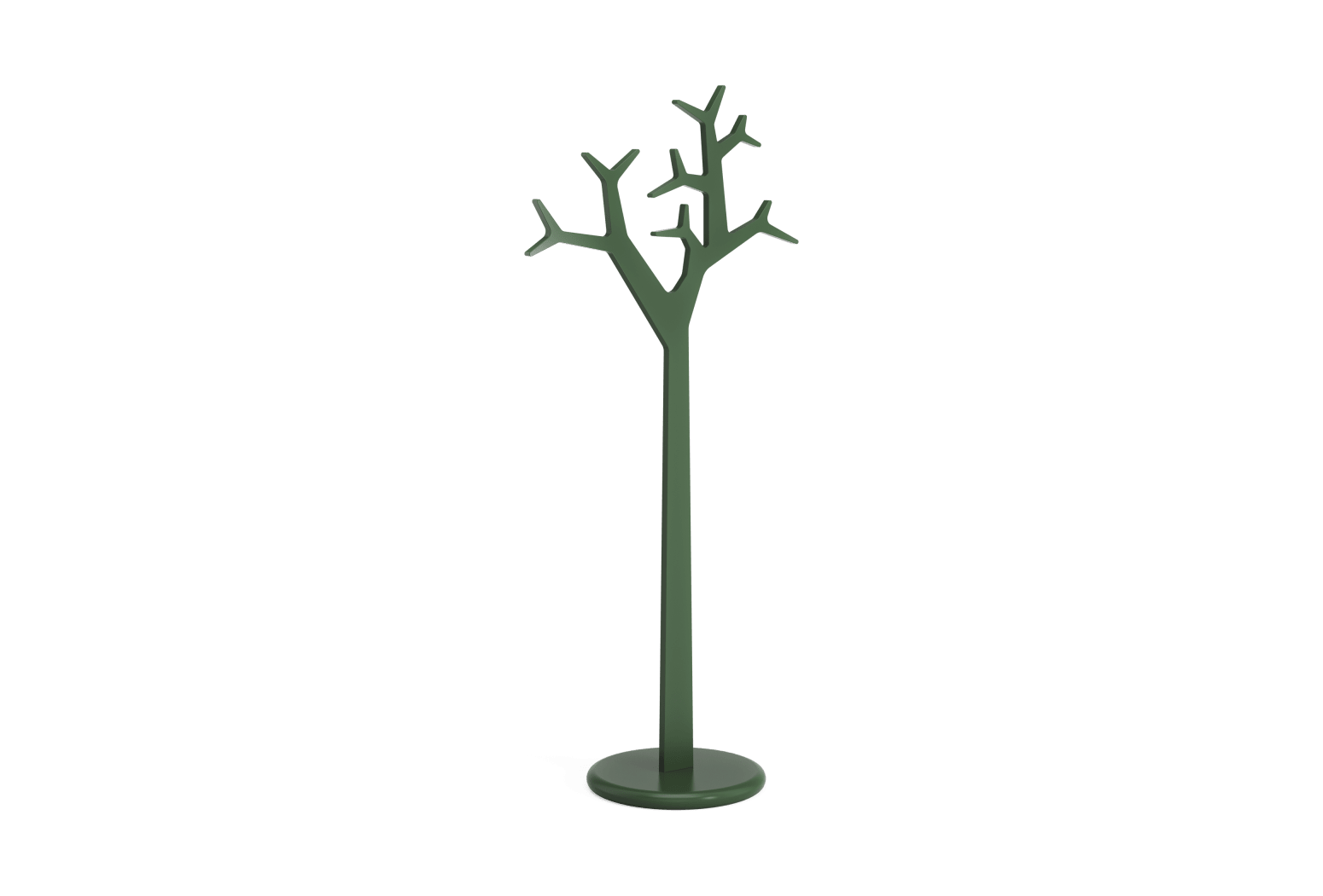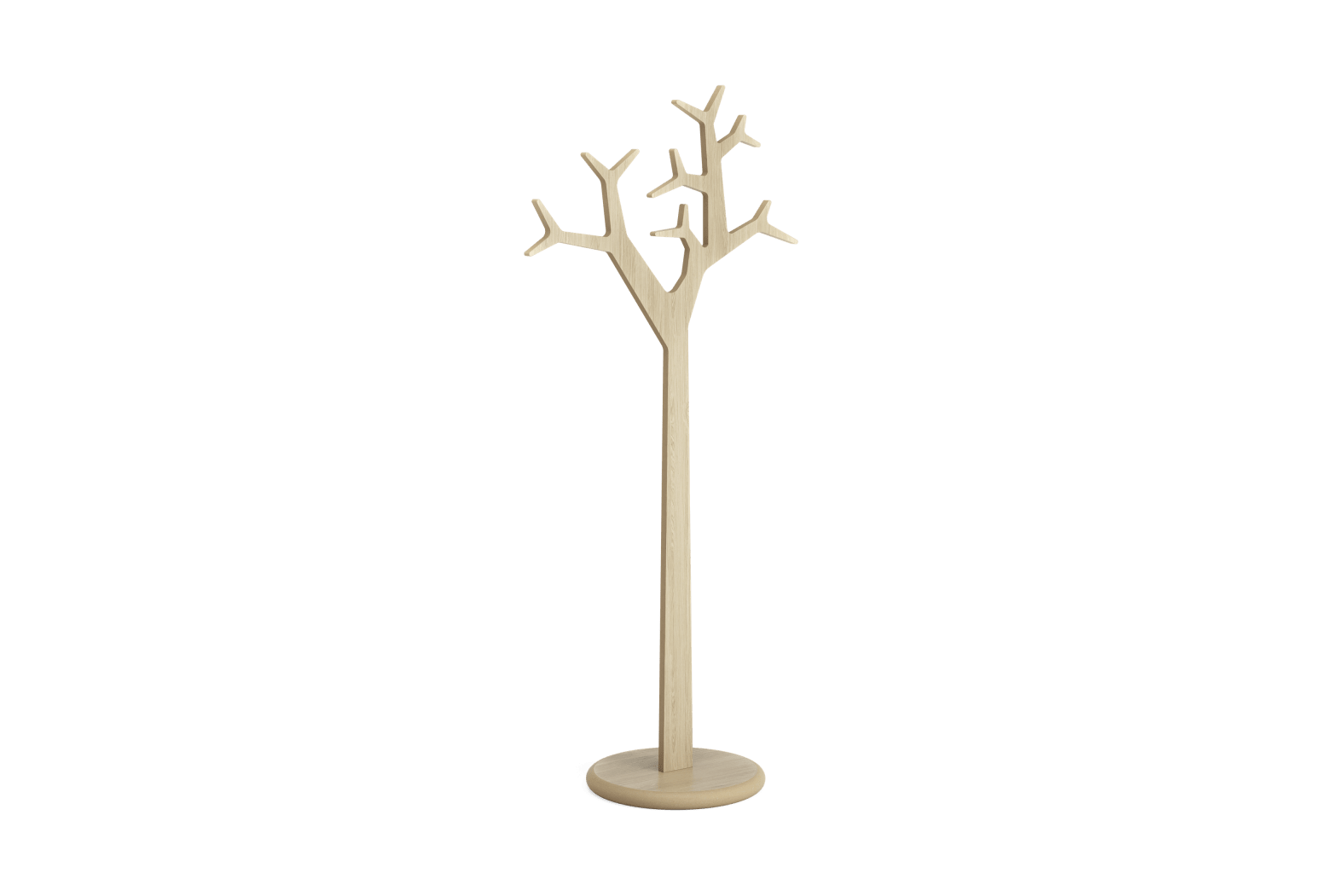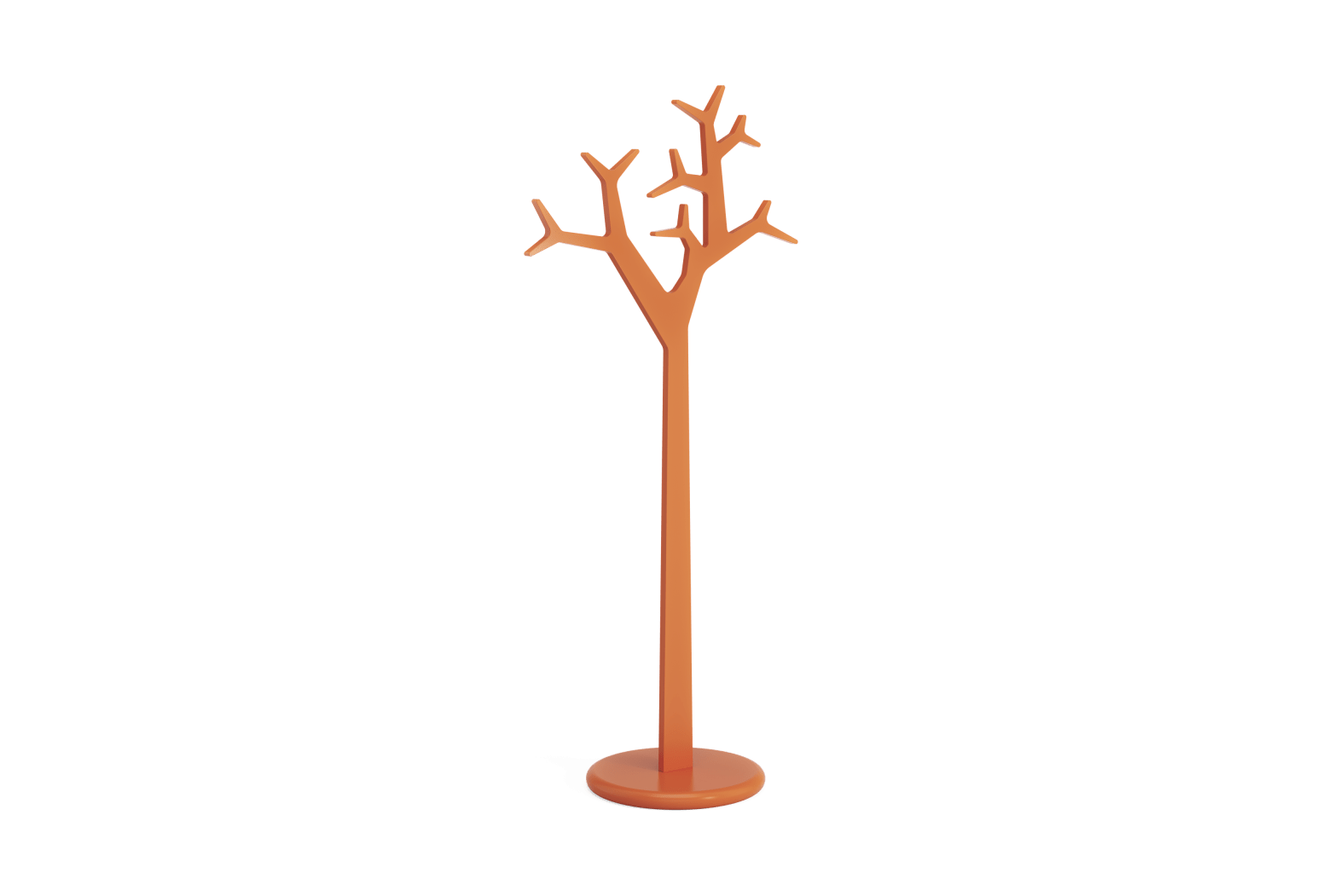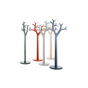 MDF in white, black, blue, grey, apricot, green or orange lacquer or oak veneer coated. Floor standing coat stand with a steel plate in the base.