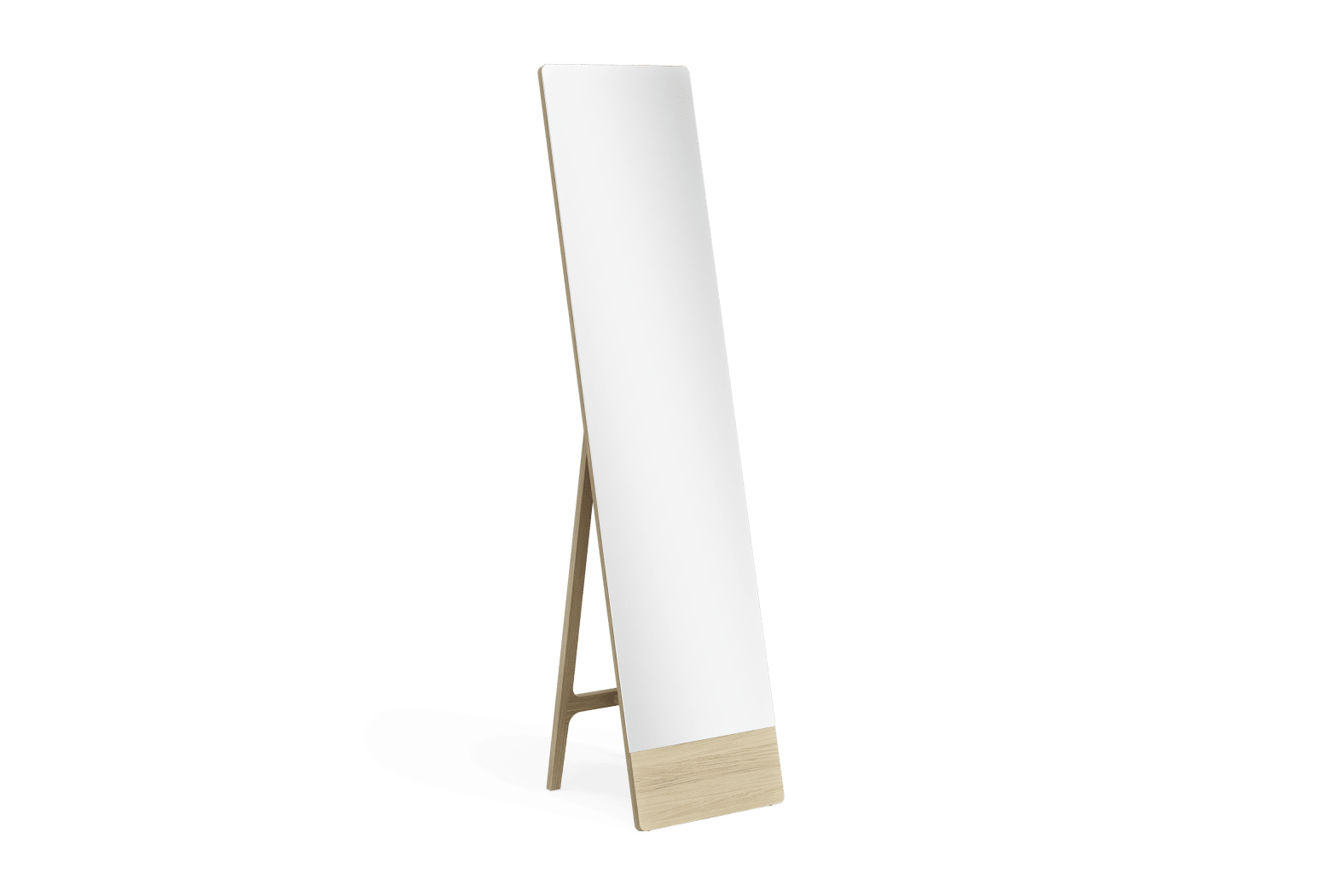 The beautiful free-standing or wall-mounted mirror Mira is available in natural oak, black stained oak and white lacquer. They are all very good-looking, just like the one standing in front of it.